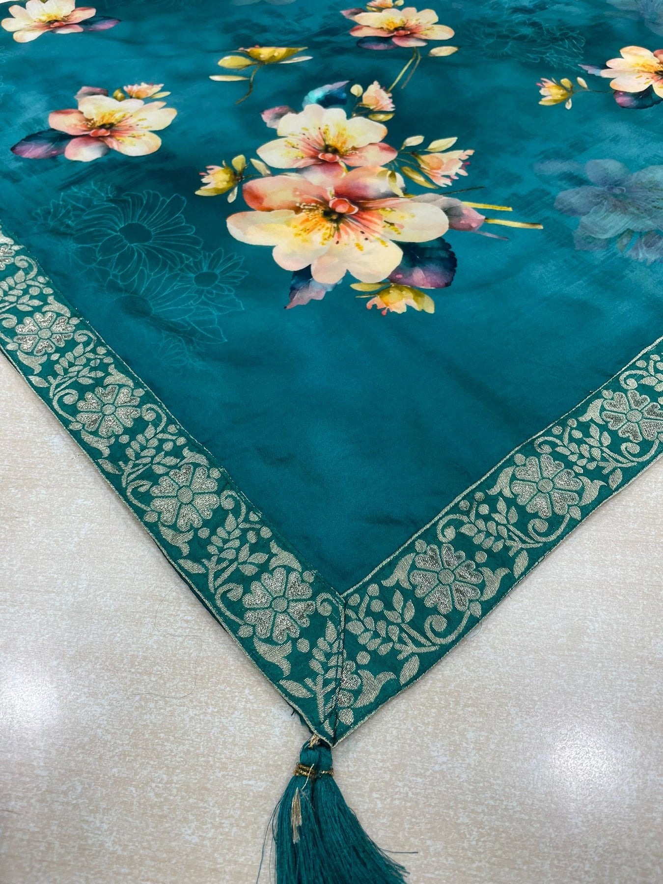 Floral Elegance – Teal Green Digital Print Dupatta with Zari Border