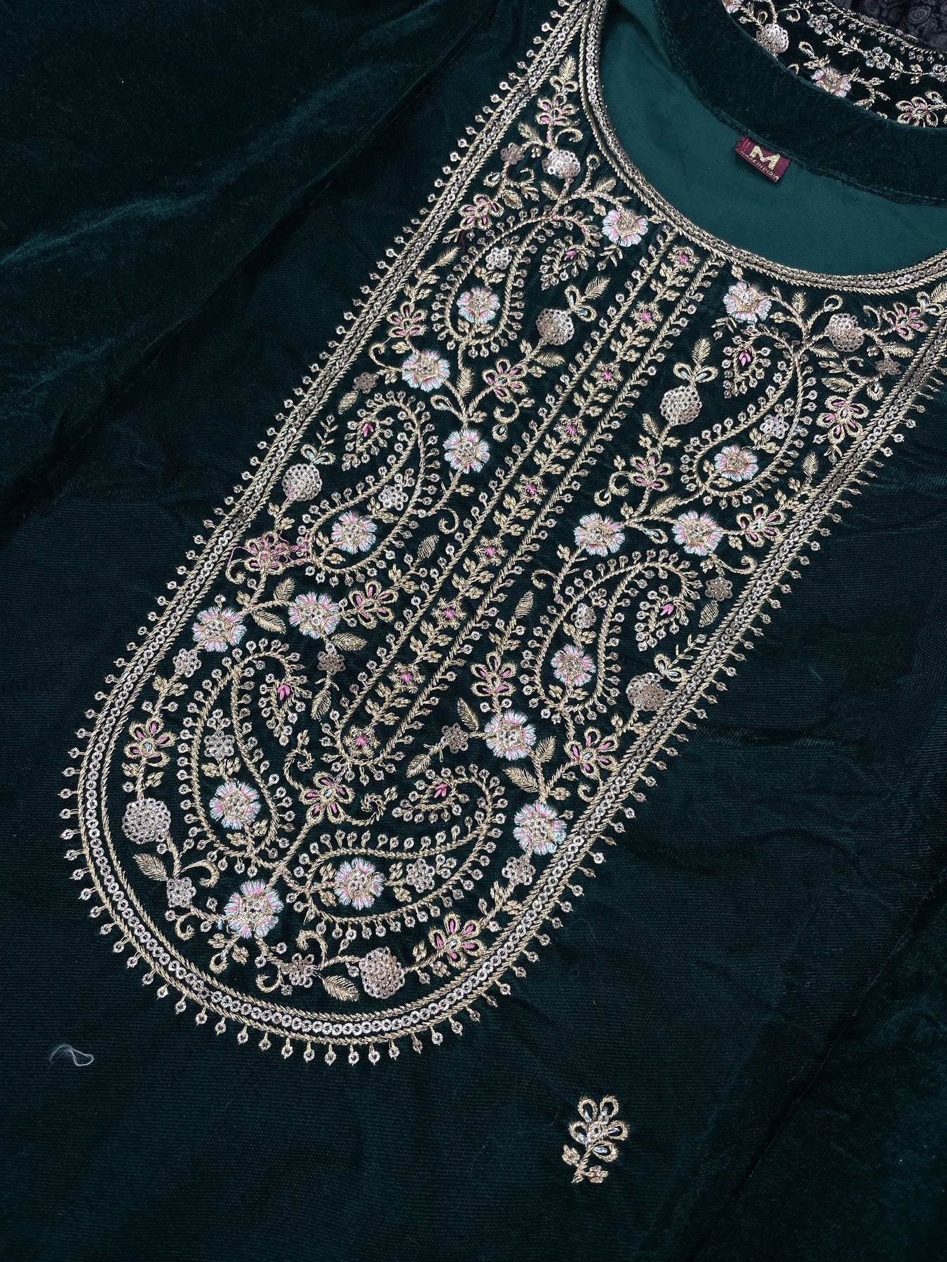 Qamar - Green Velvet Kameez - Embroidered & Gem work - 3Pcs