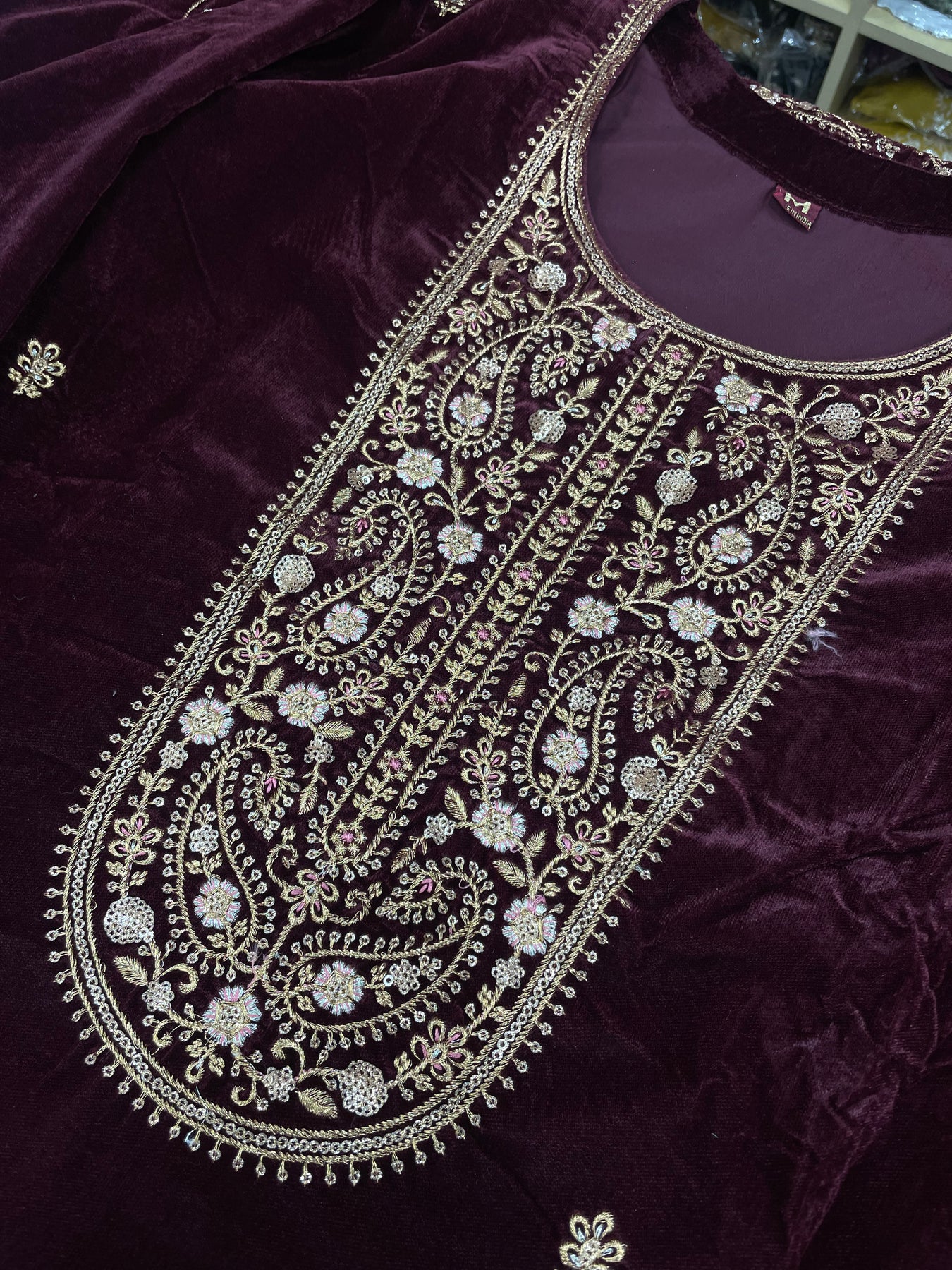 Crafted from high-quality Indian silk velvet, this suit offers a rich, thick texture with just the right amount of stretch to keep you comfortable all day (and night) long. The 42-inch kameez gives you graceful coverage, while the trousers are tailored for both structure and ease. But the real showstopper? A full-sized, matching velvet shawl that’s soft, warm, and gives off “main character at the mehndi” energy — even if you're just attending your cousin's engagement over Zoom.