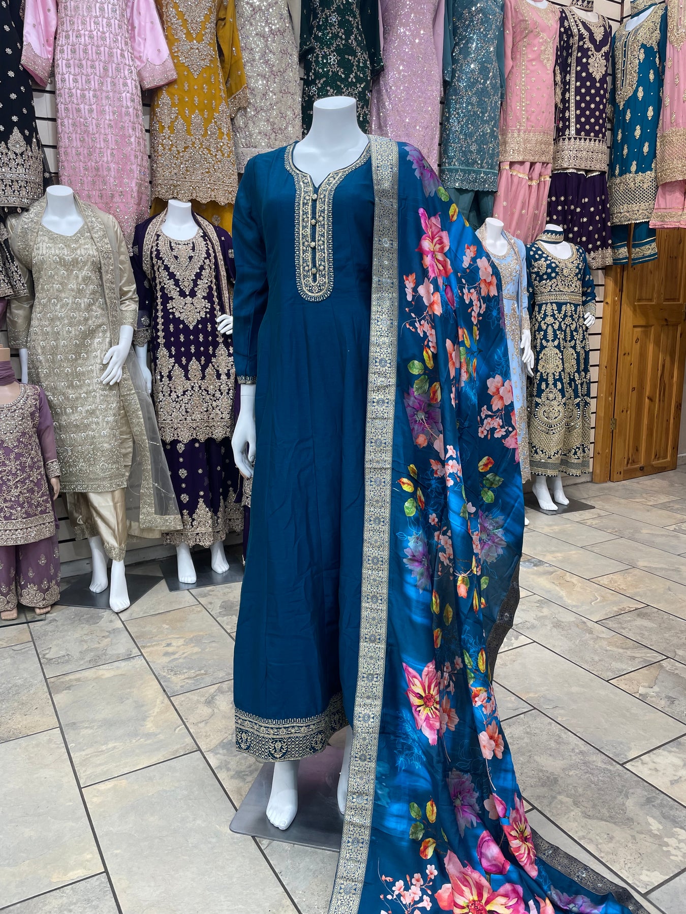 Isra – Blue Bhagalpuri Silk Anarkali with Digital Print Dupatta – 2 Pcs