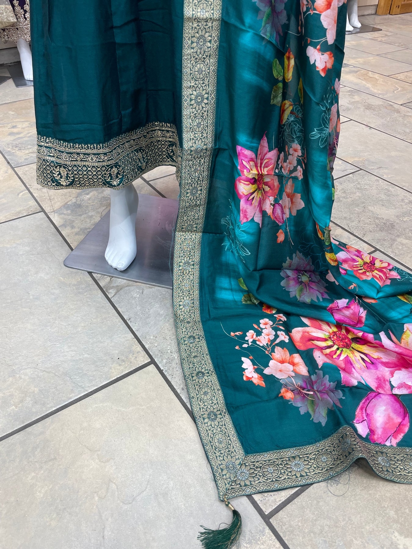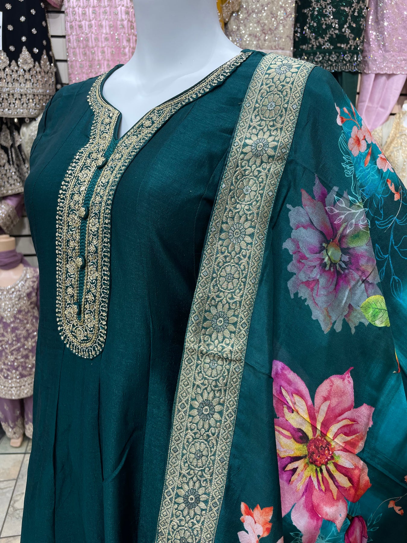 Isra – Teal Green Bhagalpuri Silk Anarkali with Digital Print Dupatta – 2 Pcs