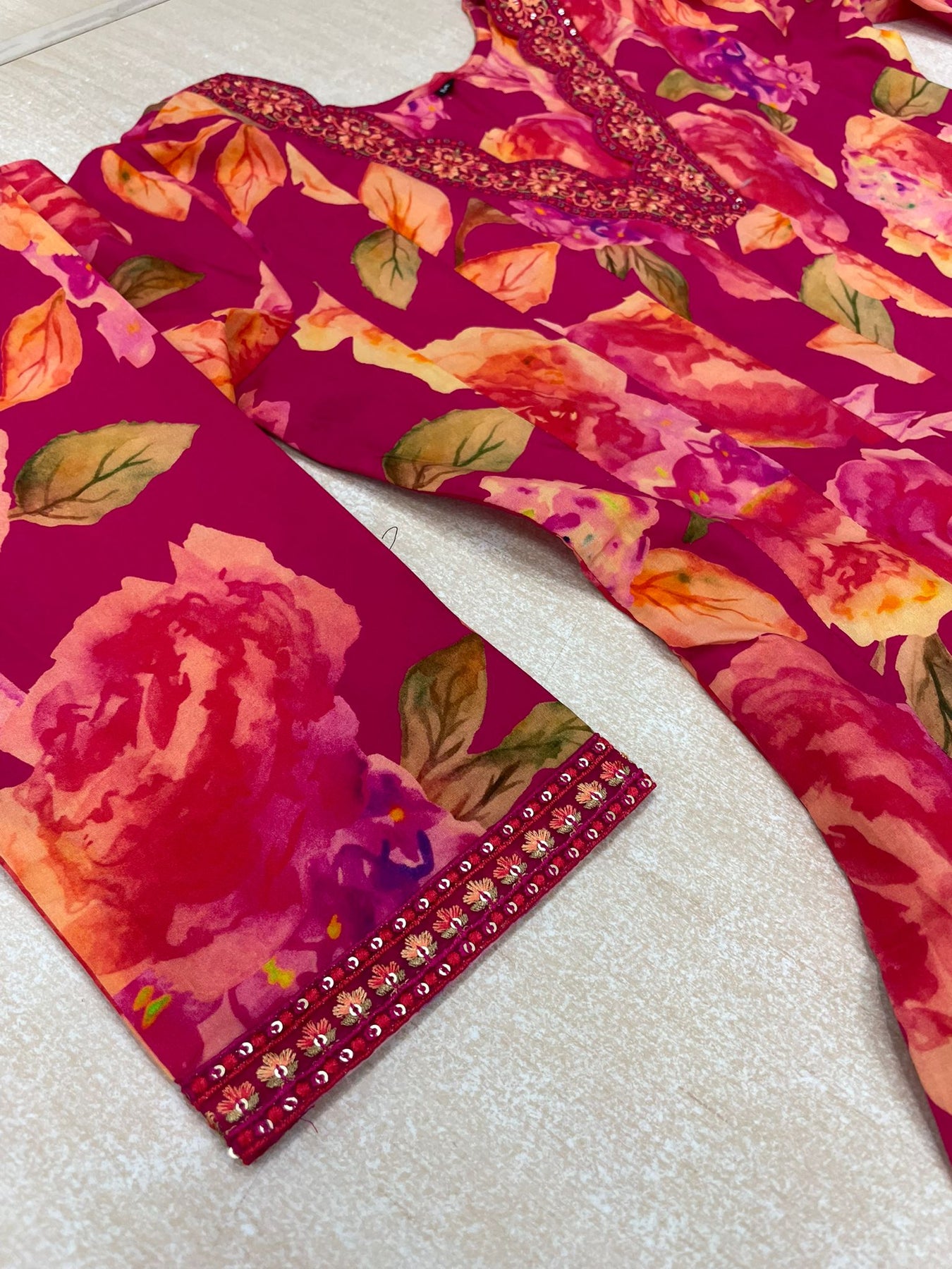 Every design in this collection features its own unique print in a single, solid tone, giving you eight beautifully distinct options to choose from. Subtle detailing includes a delicate border on the scarf and the hem of the trousers, adding just the right touch of refinement. The dress length is a consistent 49.5 inches, while the trousers measure 38 inches, ensuring a flattering drape across all sizes.