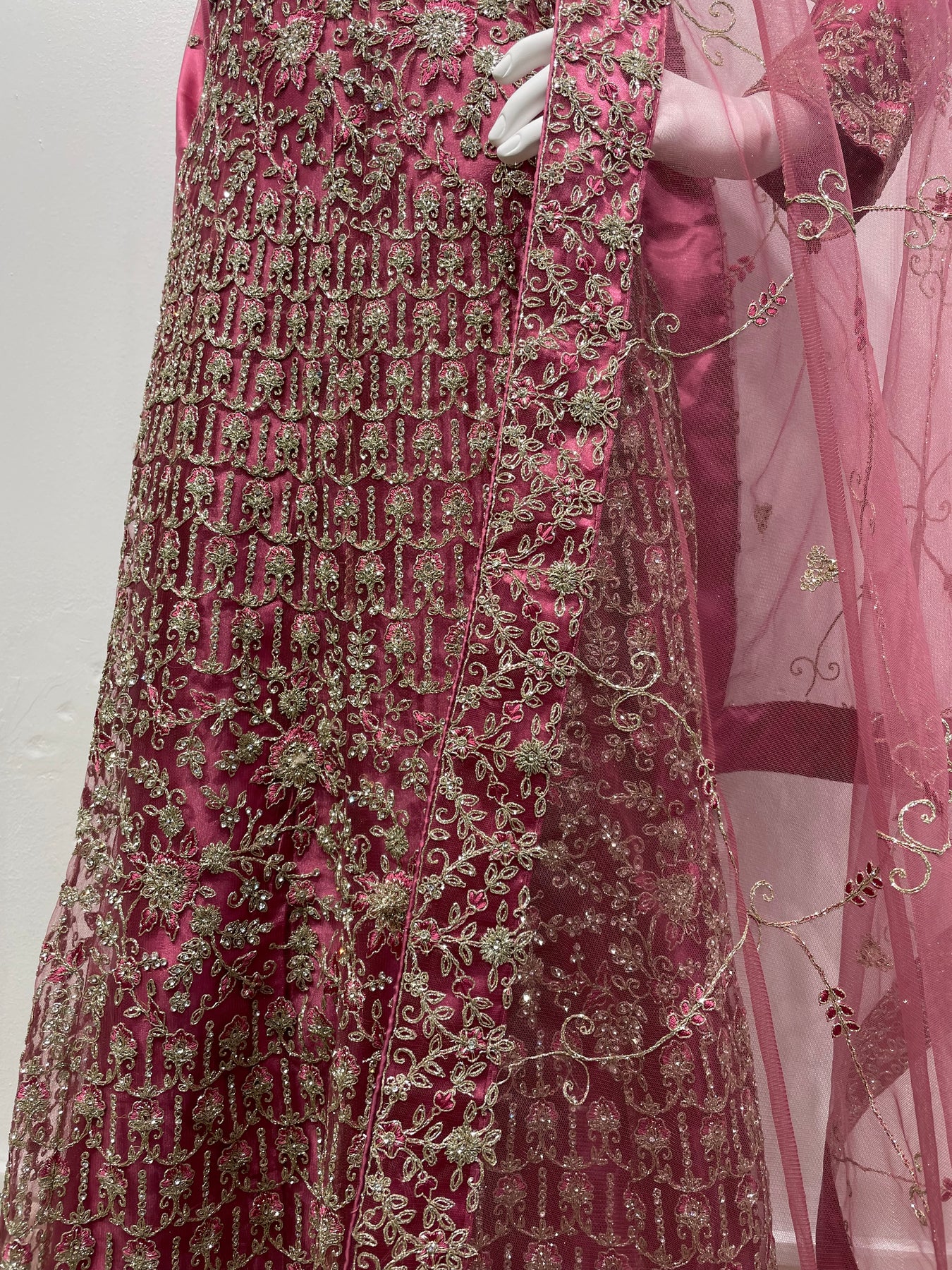 Yusra- Magenta Pink Heavy Embroidered Net Party Gown with White Gold Embroidered - 3pcs