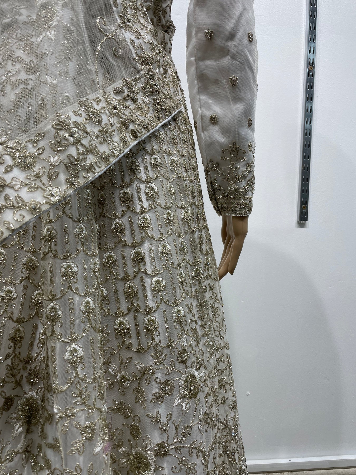 Embroidered in radiant white gold glitter thread, this suit is covered in intricate detailing from front to back, including the full sleeves and the heavily adorned scarf. Just like our original version, the dupatta is no afterthought — it's a true statement piece in itself, adding elegance and weight to the full ensemble.