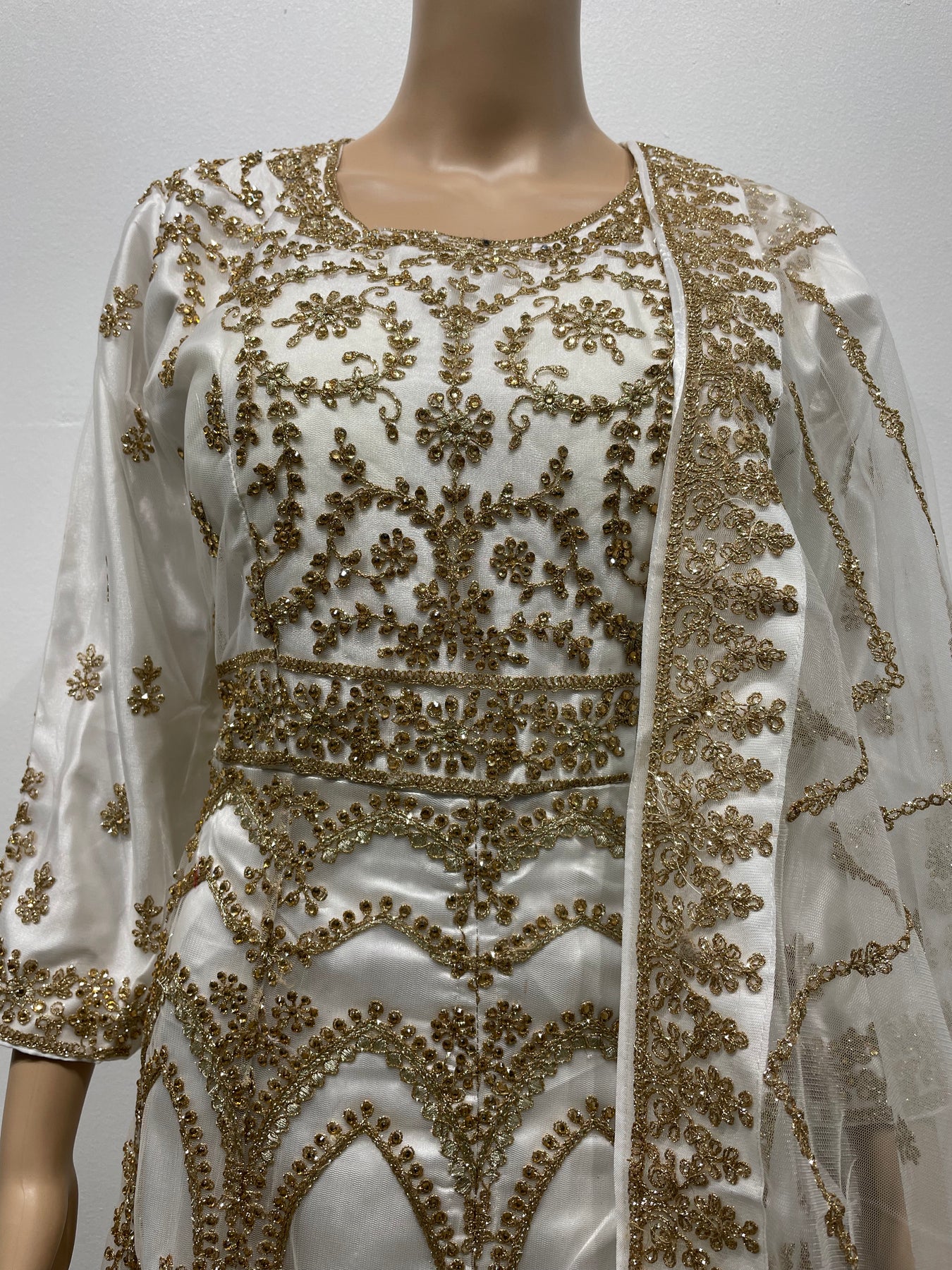Elegant net heavy embroidered gowns. It has gold thread work mixed with glitter embroidery all over the dress. Work done on both sides with soft silk lining. The dress has trousers made from palace crepe fabric and the dupatta has a heavy border on the edging. The centre of the dupatta also has matching embroidery work.
