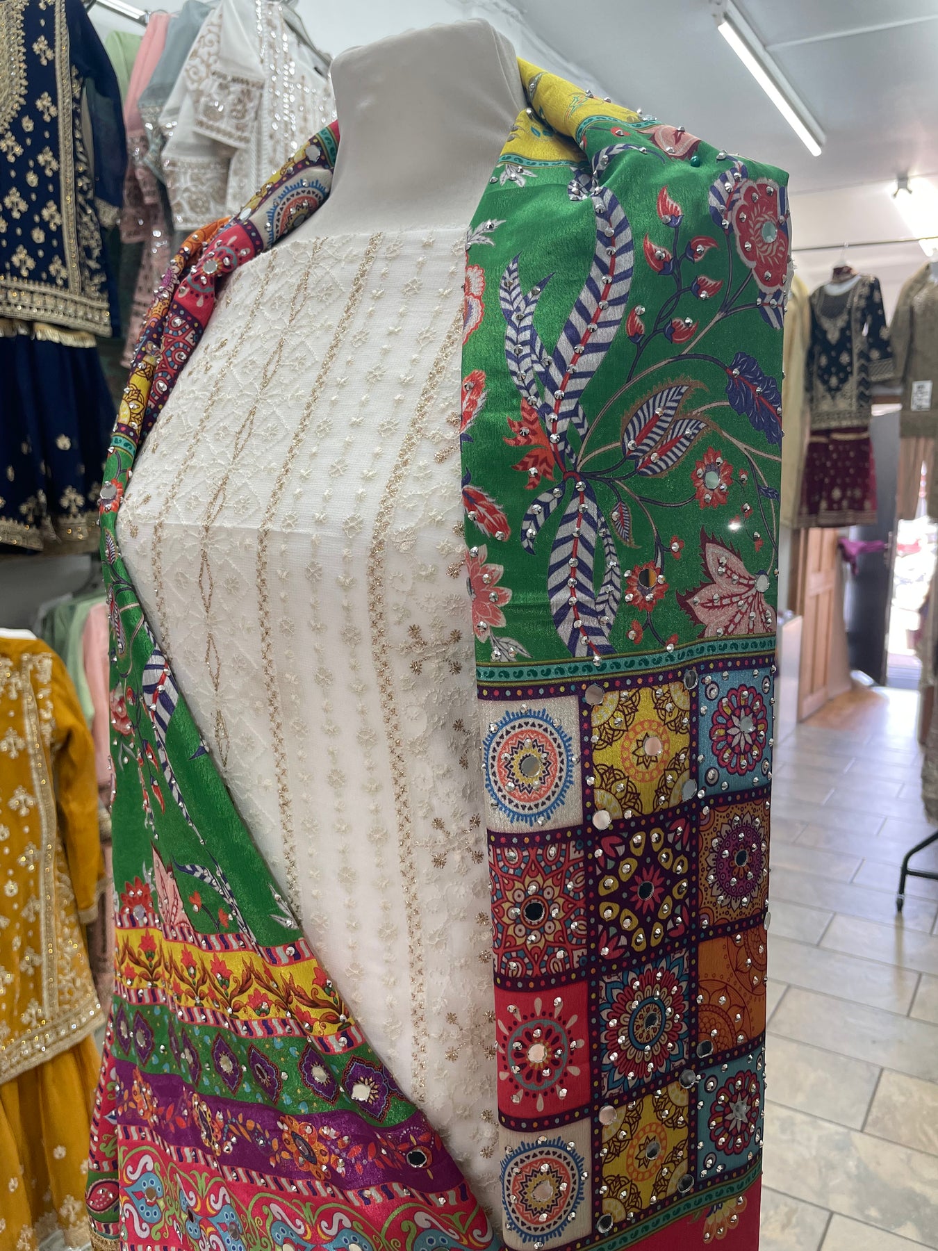 Ivory Mendhi Suit C - Full Embroidered - Unstitched