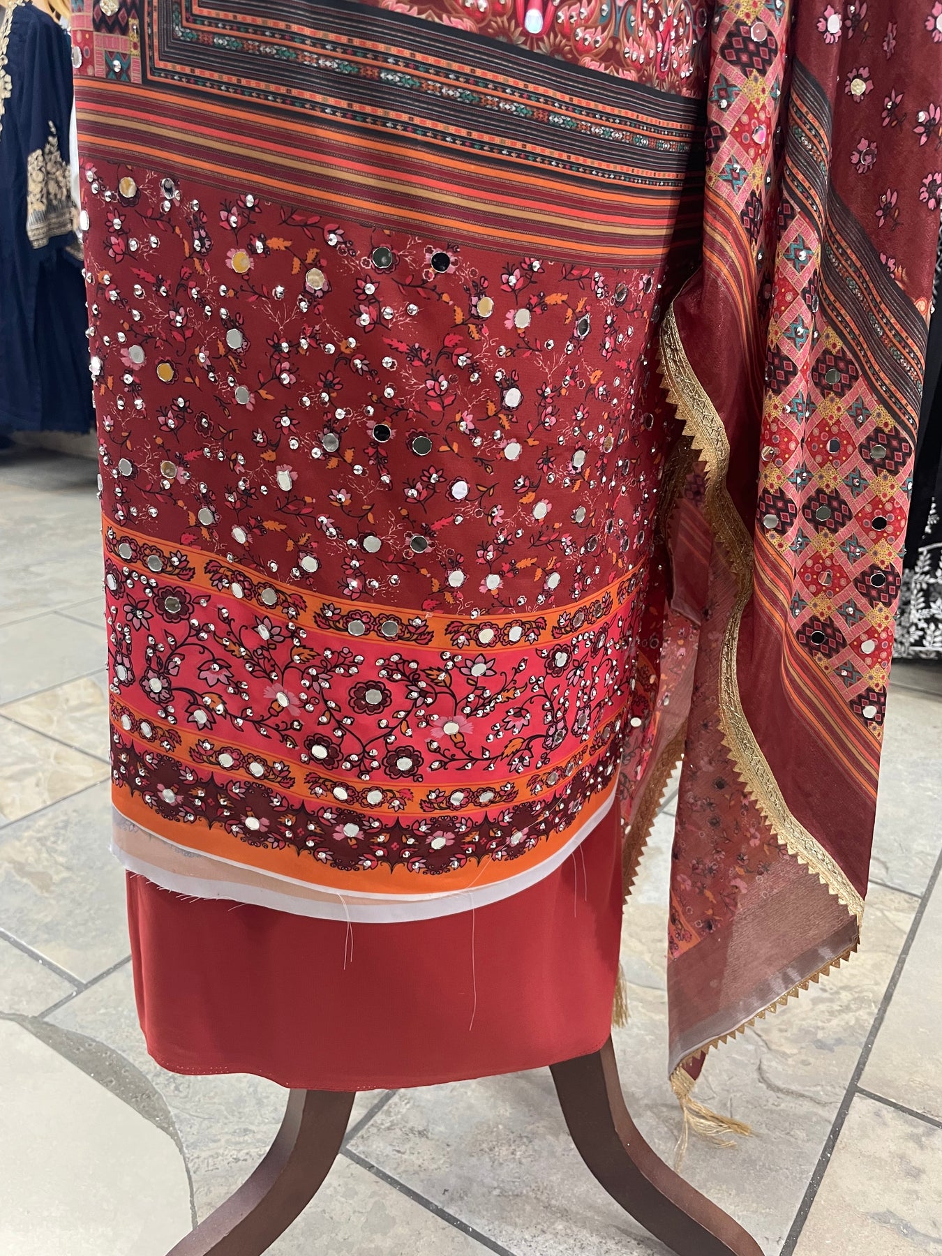 Light Chestnut Mendhi Suit E- Mirror Work - Unstitched