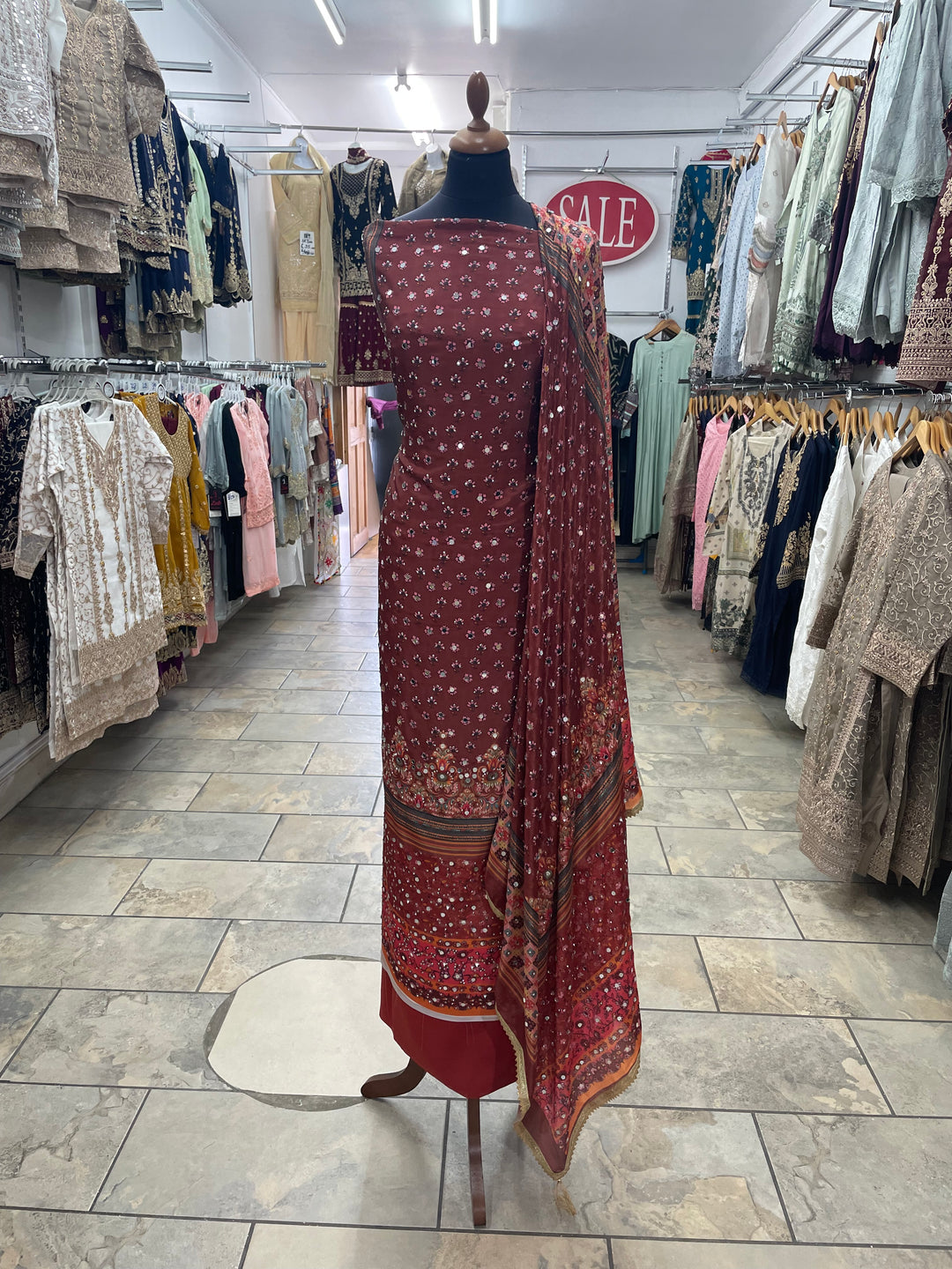Light Chestnut Mendhi Suit E- Mirror Work - Unstitched