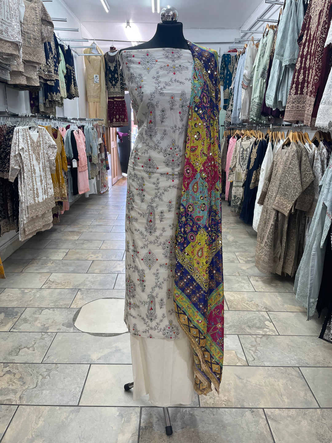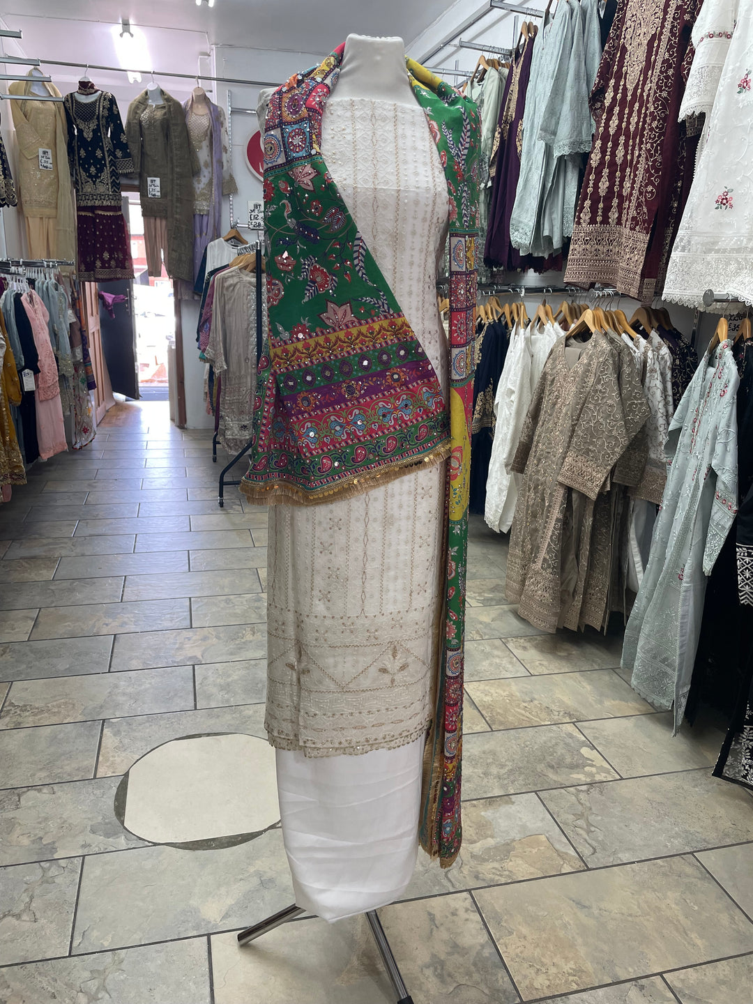 White Mendhi Suit B - Floral Embroidered - Unstitched