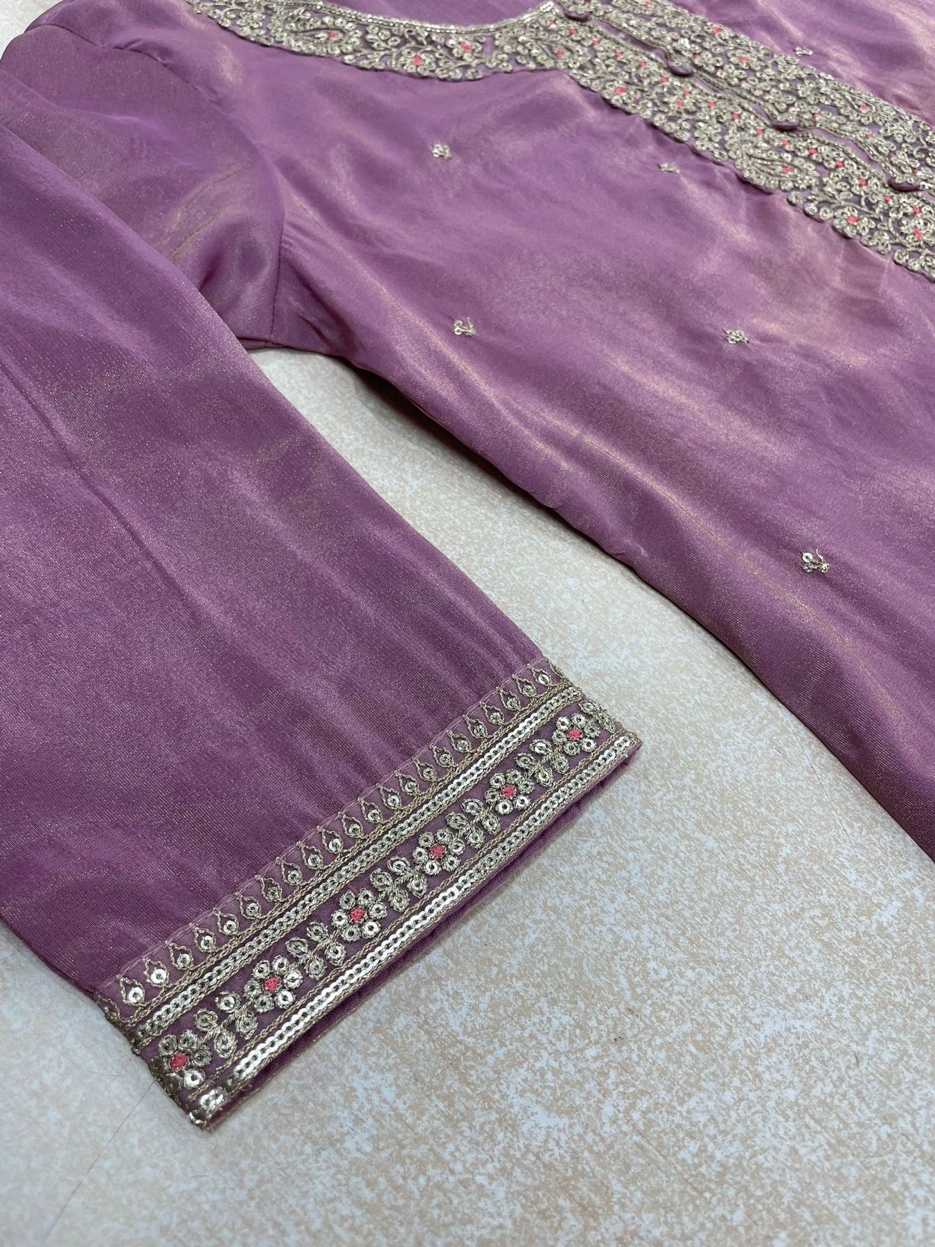 Step into understated elegance with this beautifully tailored 3-piece Masoori suit set, crafted from lightweight, textured Masoori fabric known for its subtle sheen and breathable comfort. The embroidered kameez features intricate detailing around the neckline and sleeves, bringing just the right amount of festive refinement to the look. Paired with wide-leg palazzo trousers, also in soft Masoori, the silhouette flows effortlessly, offering both structure and grace. The set is completed with a digitally printed Masoori dupatta, lightweight and airy, featuring delicate floral patterns that tie the whole outfit together. Perfect for festive events, formal gatherings, or stylish daytime occasions, this suit blends traditional charm with modern simplicity.