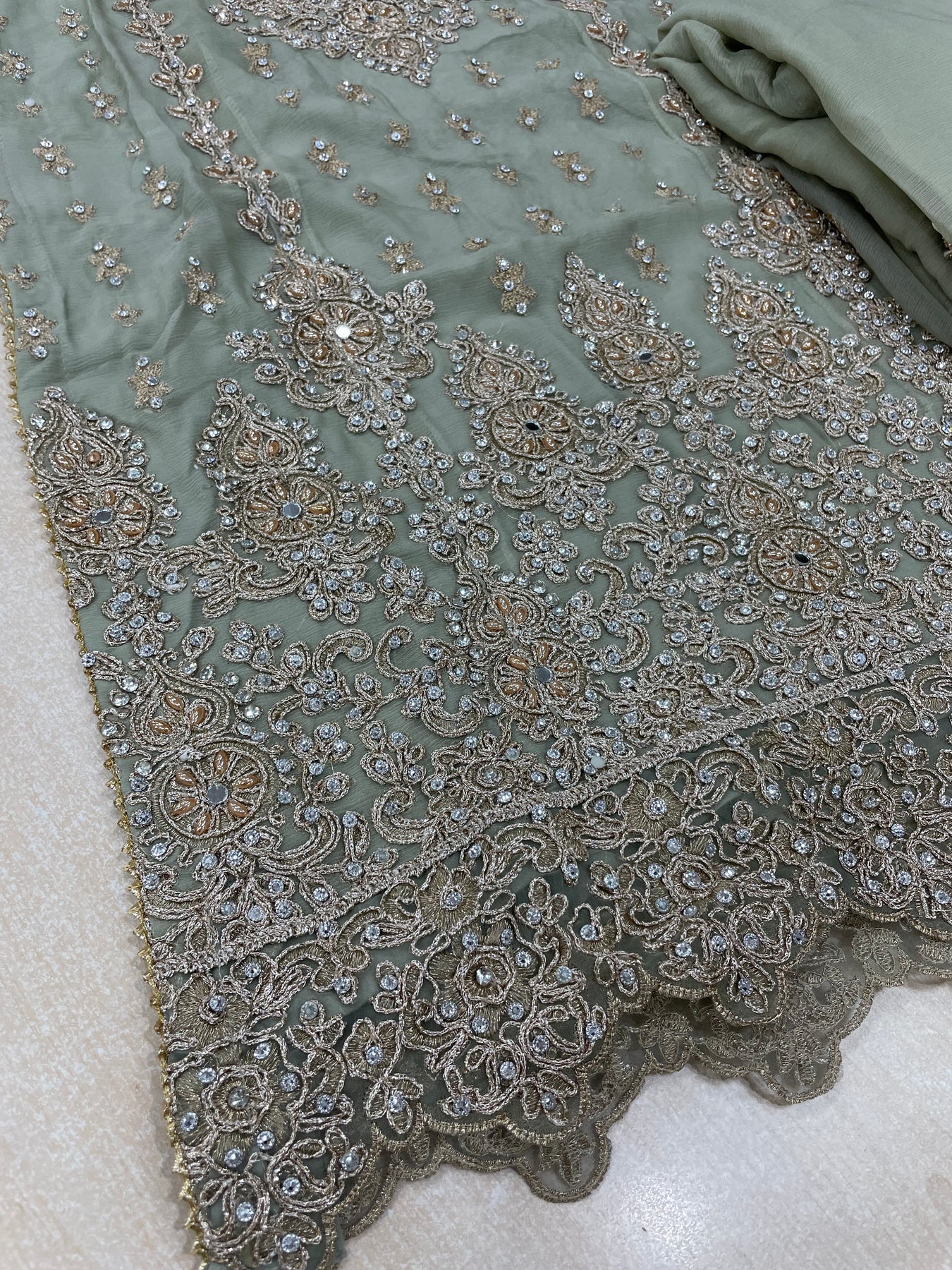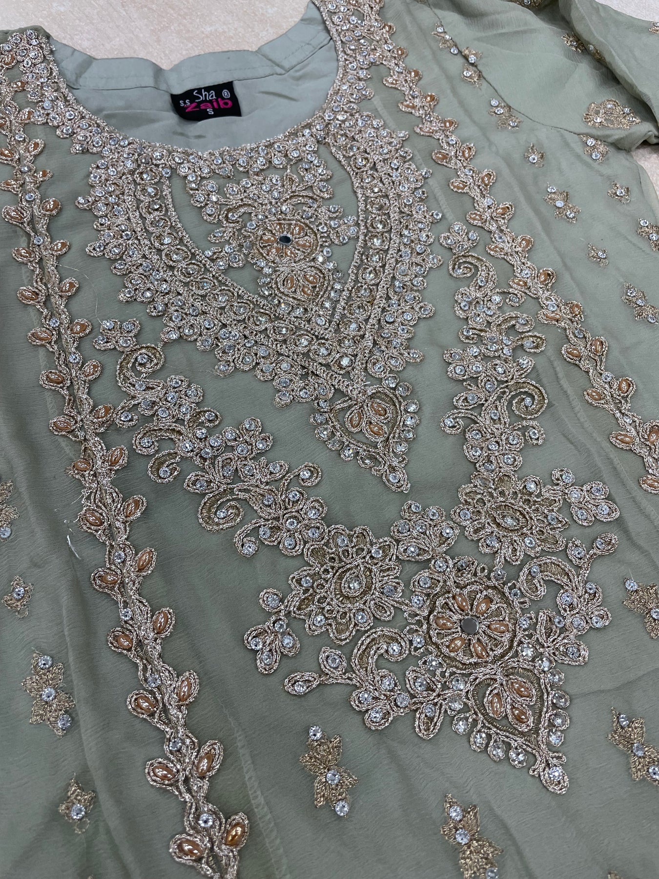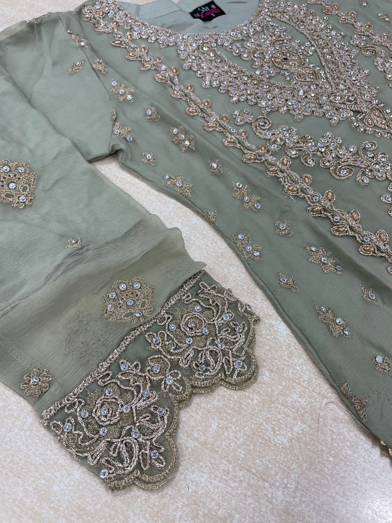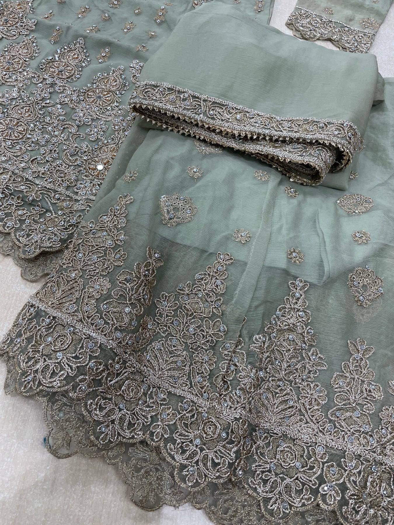 Aisha - Sage Green embroidered Plazo - Rose Gold Embroidered & Gem work - 3Pcs