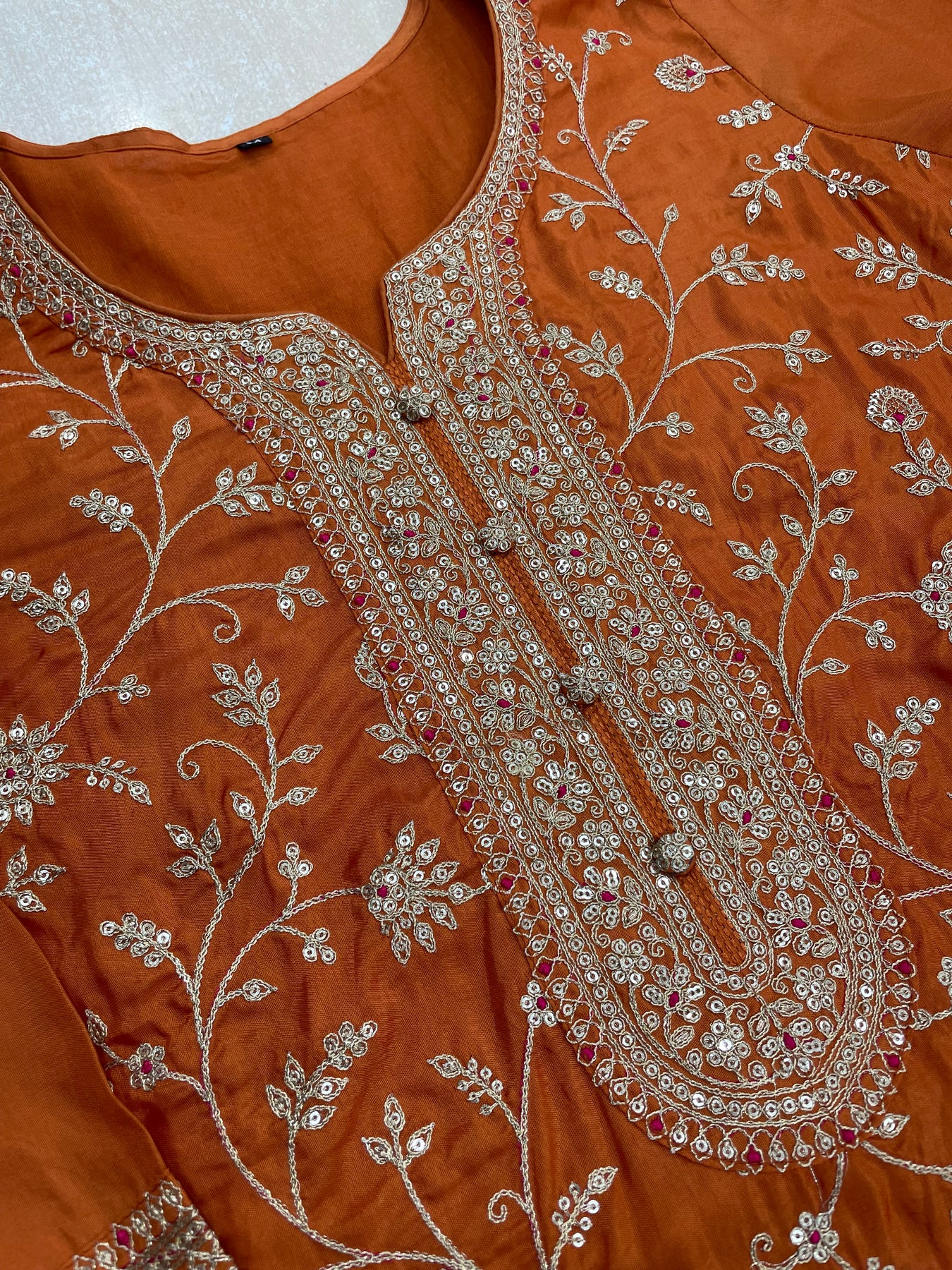 Aleeza – Orange Pure Silk Embroidered Set with Jacquard Dupatta - 3pcs
