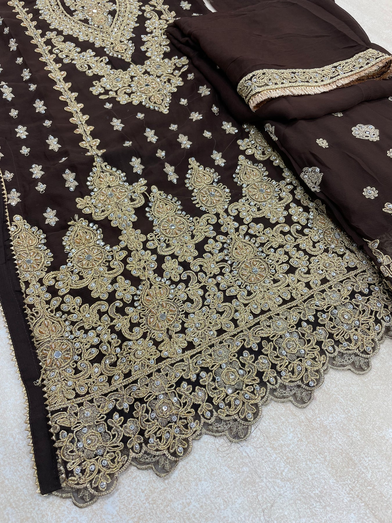 Aisha - Brown embroidered Plazo - Gold Embroidered & Gem work - 3Pcs