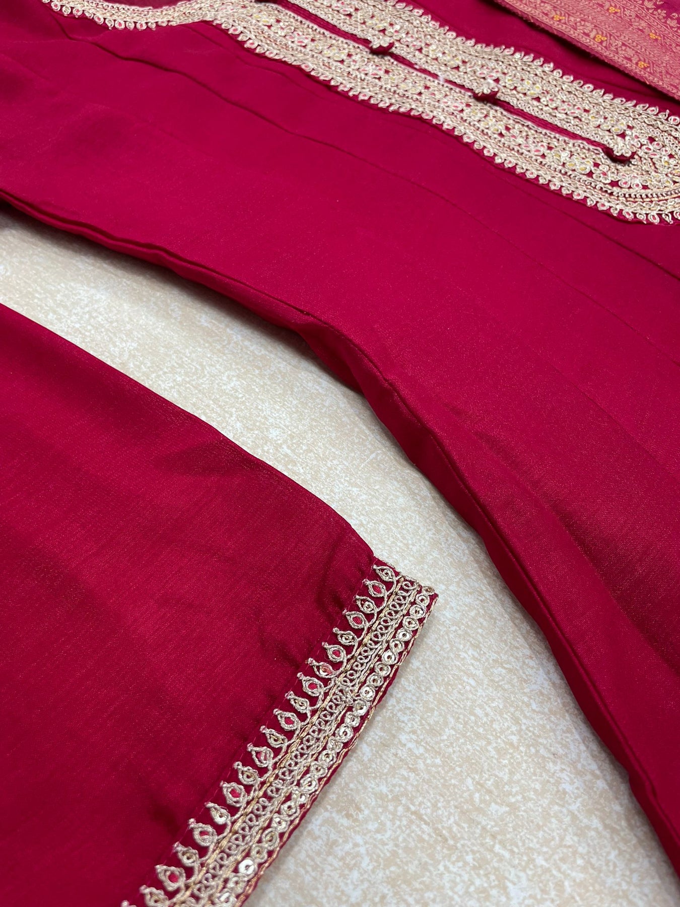 The signature chest design remains consistent across all colours, with intricate detailing adjusted to complement the base shade of each suit. The true showstopper is the fully embroidered bottom border, which runs seamlessly around the hem of the 56-inch long dress, showcasing the highest level of craftsmanship. This suit is designed to flow beautifully and stand out in any gathering, from intimate ceremonies to grand celebrations.