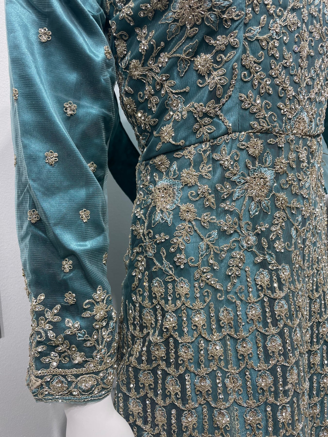 Embroidered in radiant white gold glitter thread, this suit is covered in intricate detailing from front to back, including the full sleeves and the heavily adorned scarf. Just like our original version, the dupatta is no afterthought — it's a true statement piece in itself, adding elegance and weight to the full ensemble.