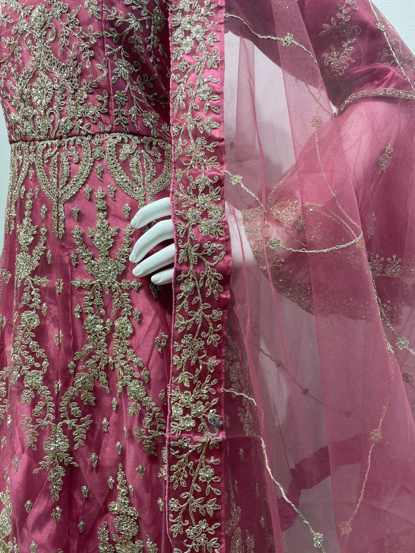 Jannah - Magenta Pink Heavy Embroidered Net Party Gown with Bell Sleeves/White Gold Embroidered - 3pcs