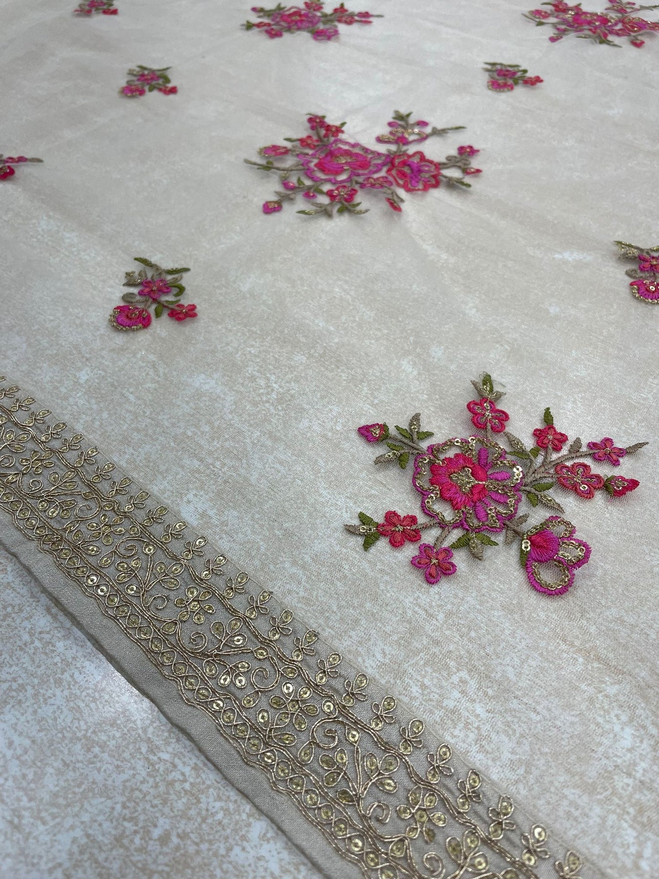 The highlight of this design lies in the matching neck and border embroidery — an understated yet elegant rose gold thread work that adds just the right amount of shimmer without overwhelming the look. The same embroidery continues onto the jacquard net dupatta (86 x 32 inches), which is further enhanced with delicately embroidered floral details across the inner panel, adding depth and texture.