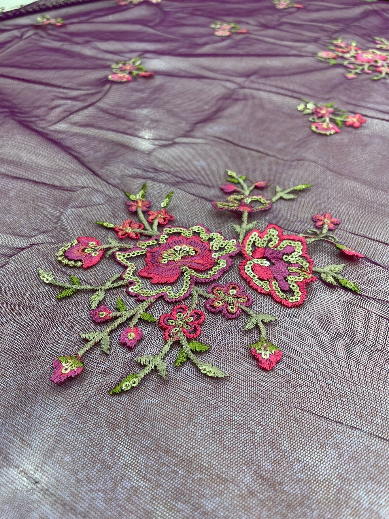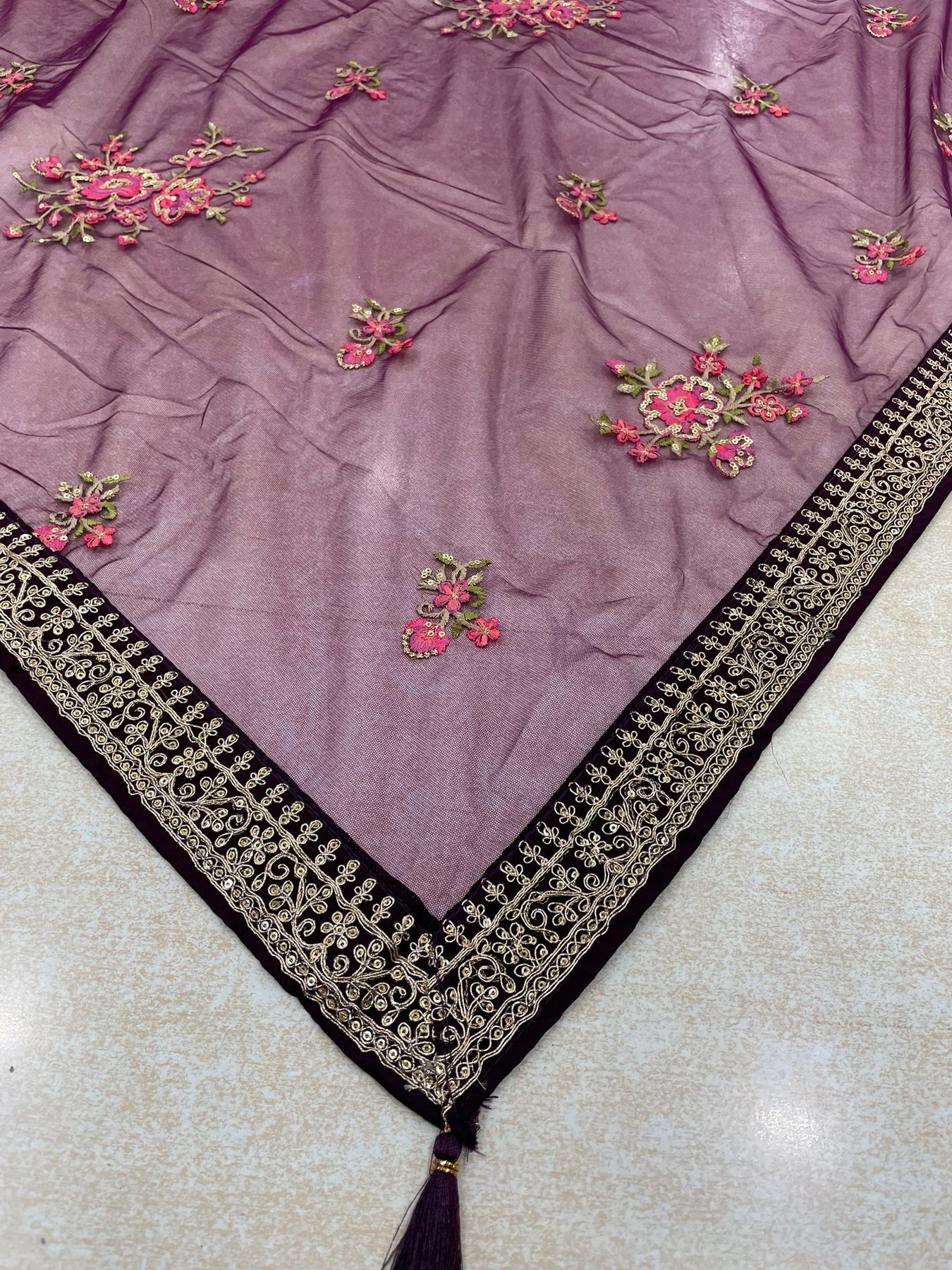 The highlight of this design lies in the matching neck and border embroidery — an understated yet elegant rose gold thread work that adds just the right amount of shimmer without overwhelming the look. The same embroidery continues onto the jacquard net dupatta (86 x 32 inches), which is further enhanced with delicately embroidered floral details across the inner panel, adding depth and texture.