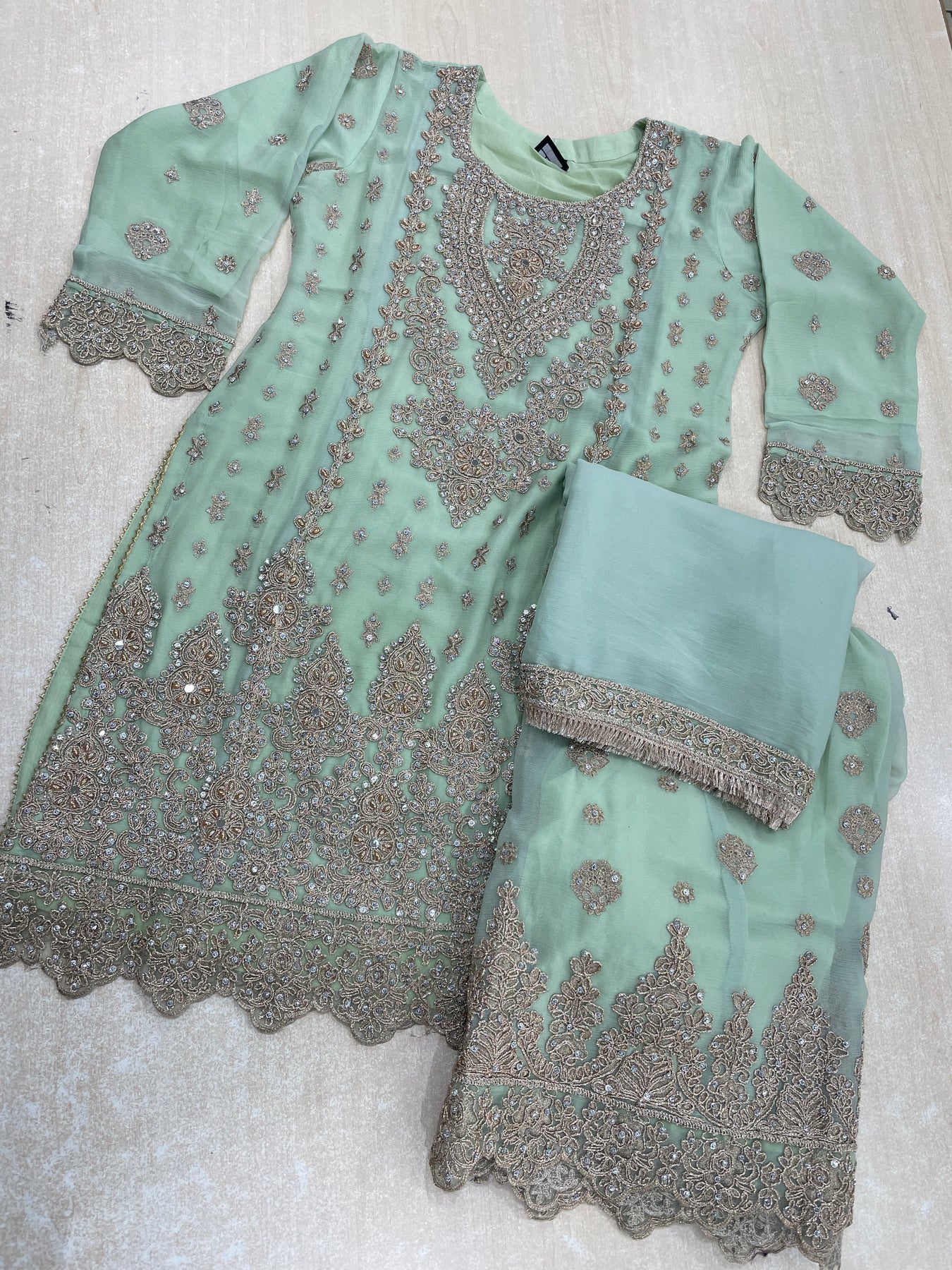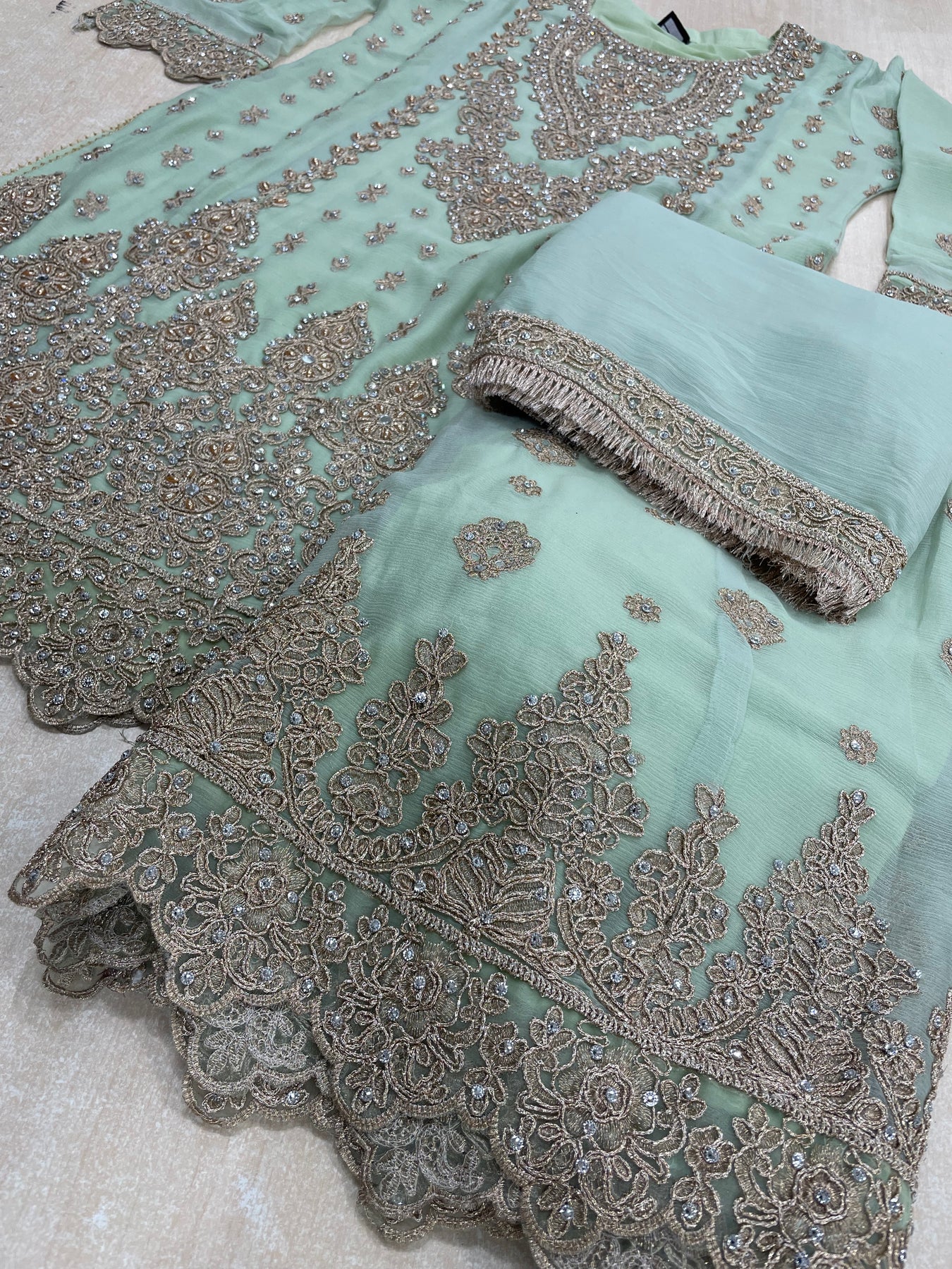 Aisha - Mint Green embroidered Plazo - Rose Gold Embroidered & Gem work - 3Pcs
