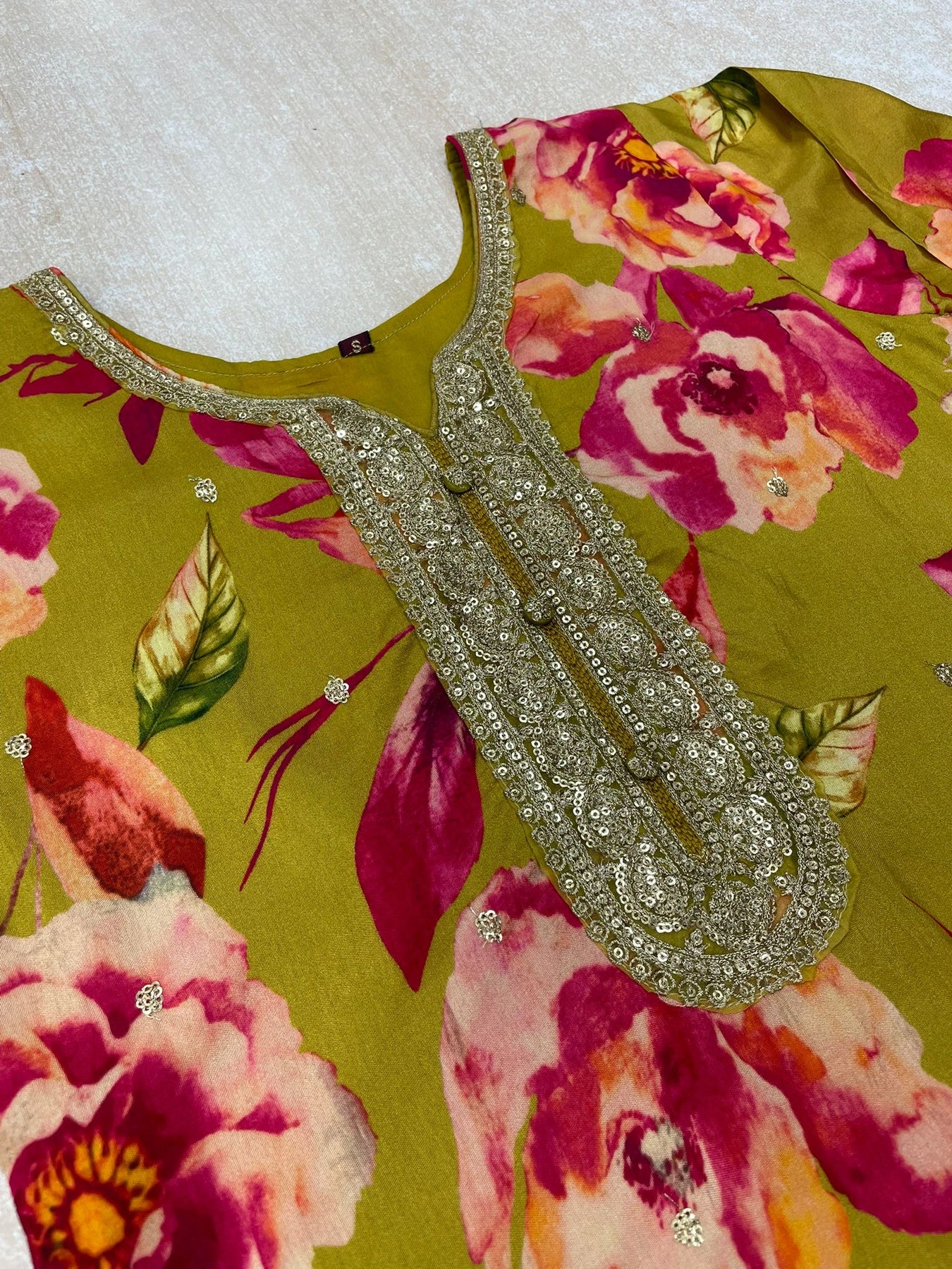 Both the top and wide-legged plazos are crafted from premium pure silk, offering a luxurious feel and a naturally flattering drape. The fabric is adorned with a delicate floral print, giving it a soft, feminine charm. To enhance the look, the top features fine embroidered flowers scattered throughout, adding subtle texture and refined detailing that catches the eye without overwhelming the design.