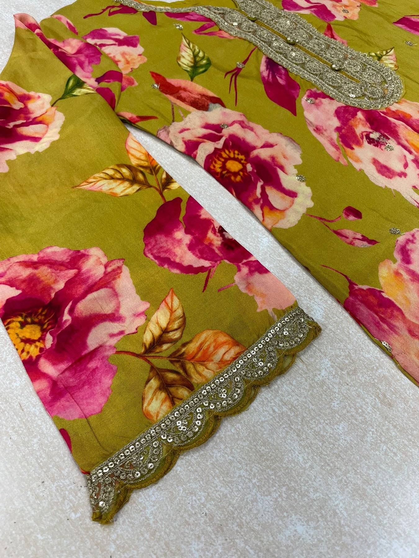 Nura - Mustard - Pure Silk Printed Plazo Kameez with Georgette Dupatta - Co-ord - 3pcs