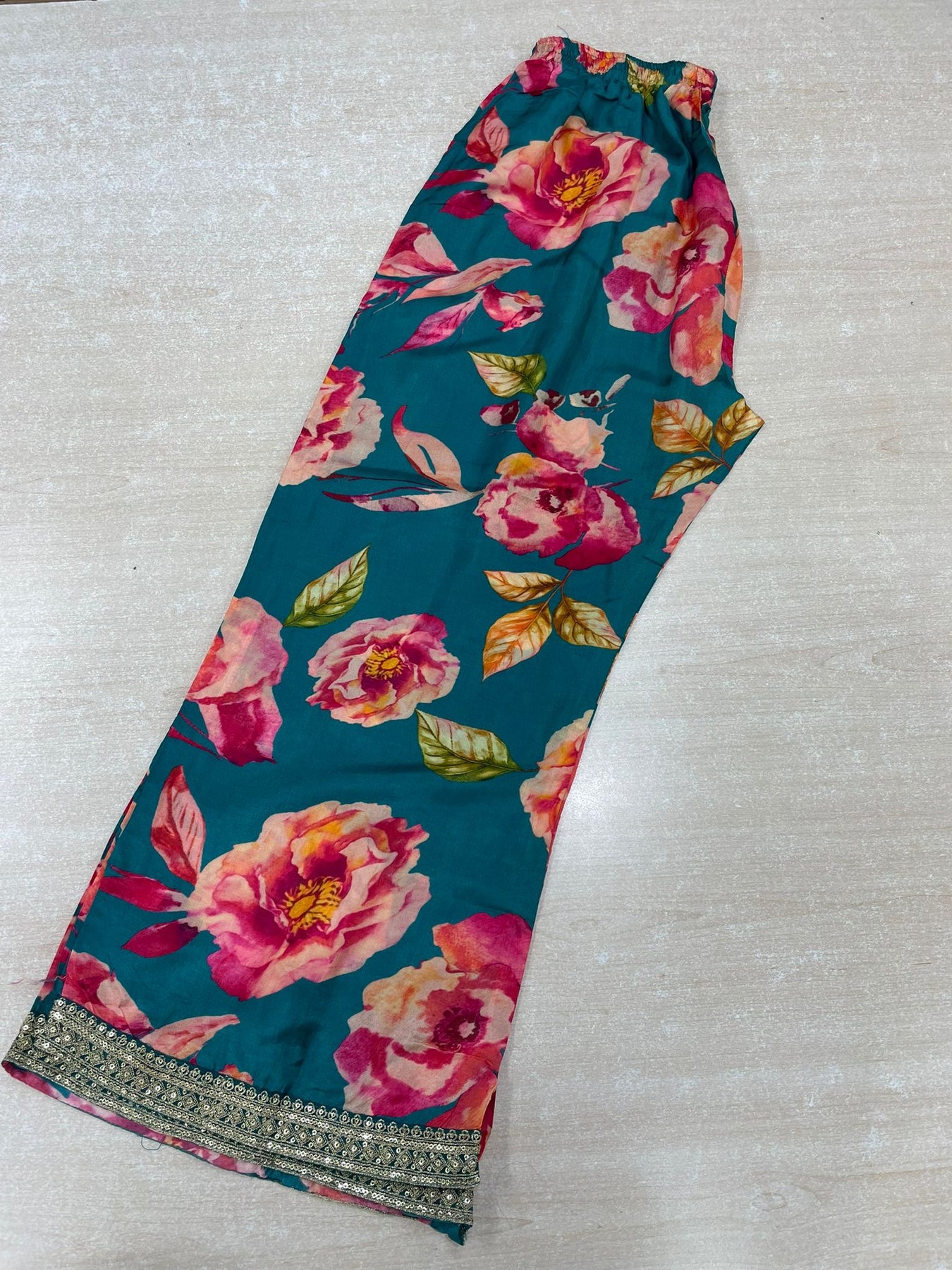 Both the top and wide-legged plazos are crafted from premium pure silk, offering a luxurious feel and a naturally flattering drape. The fabric is adorned with a delicate floral print, giving it a soft, feminine charm. To enhance the look, the top features fine embroidered flowers scattered throughout, adding subtle texture and refined detailing that catches the eye without overwhelming the design.