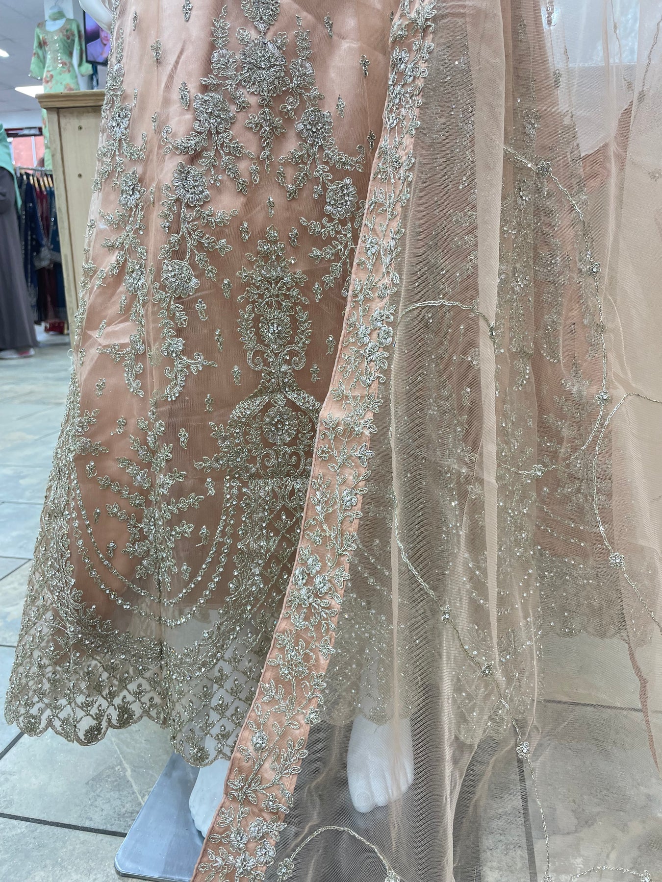 When we say this is the statement piece of the season — we mean it. This premium net party gown is not only our most expensive suit in-store, it’s also the most heavily embellished and intricately designed from top to bottom. Every inch is covered in shiny, glitter-thread embroidery — front, back, sleeves, and even the dupatta. Yes, this one does the most, and proudly so.