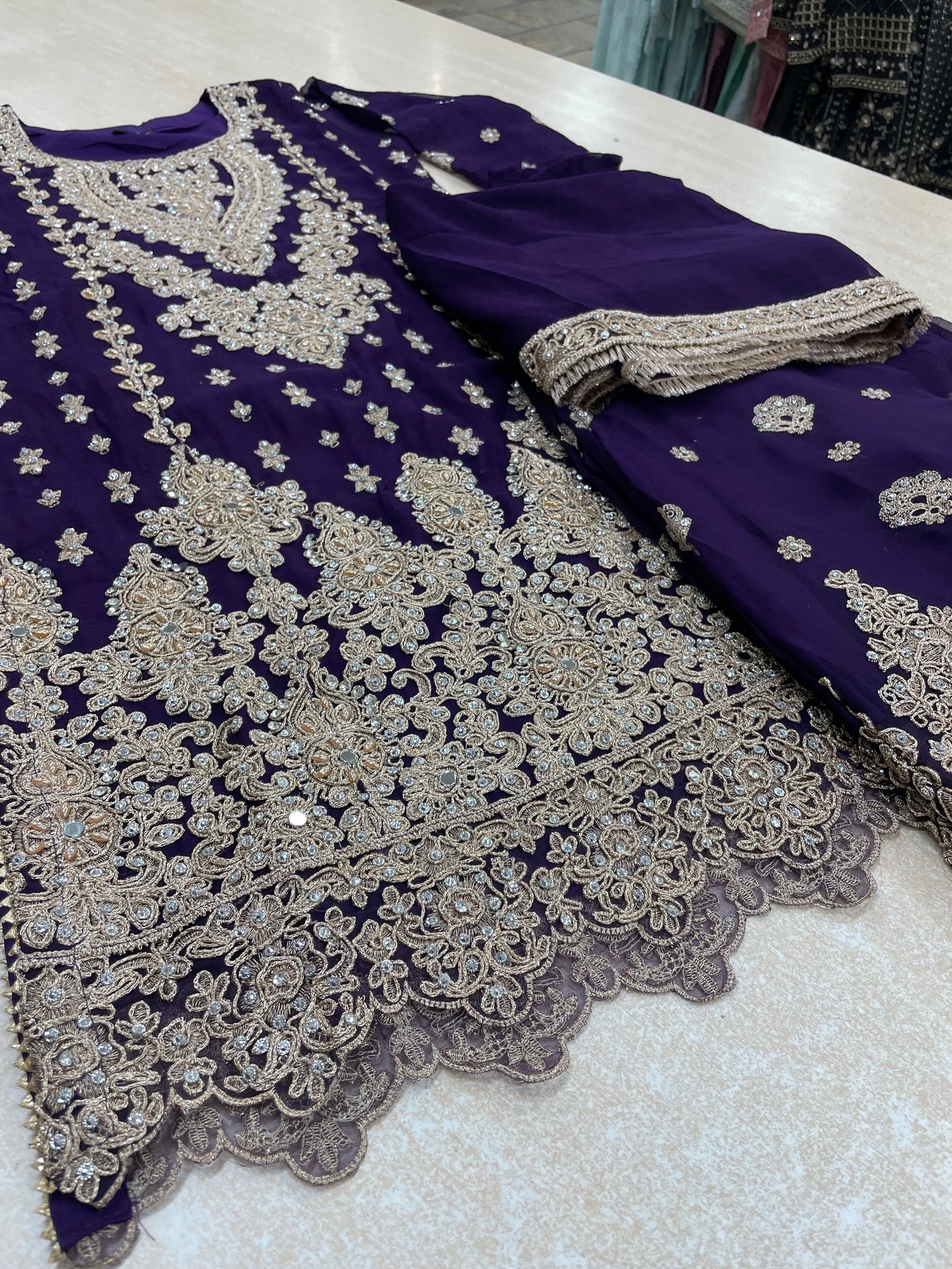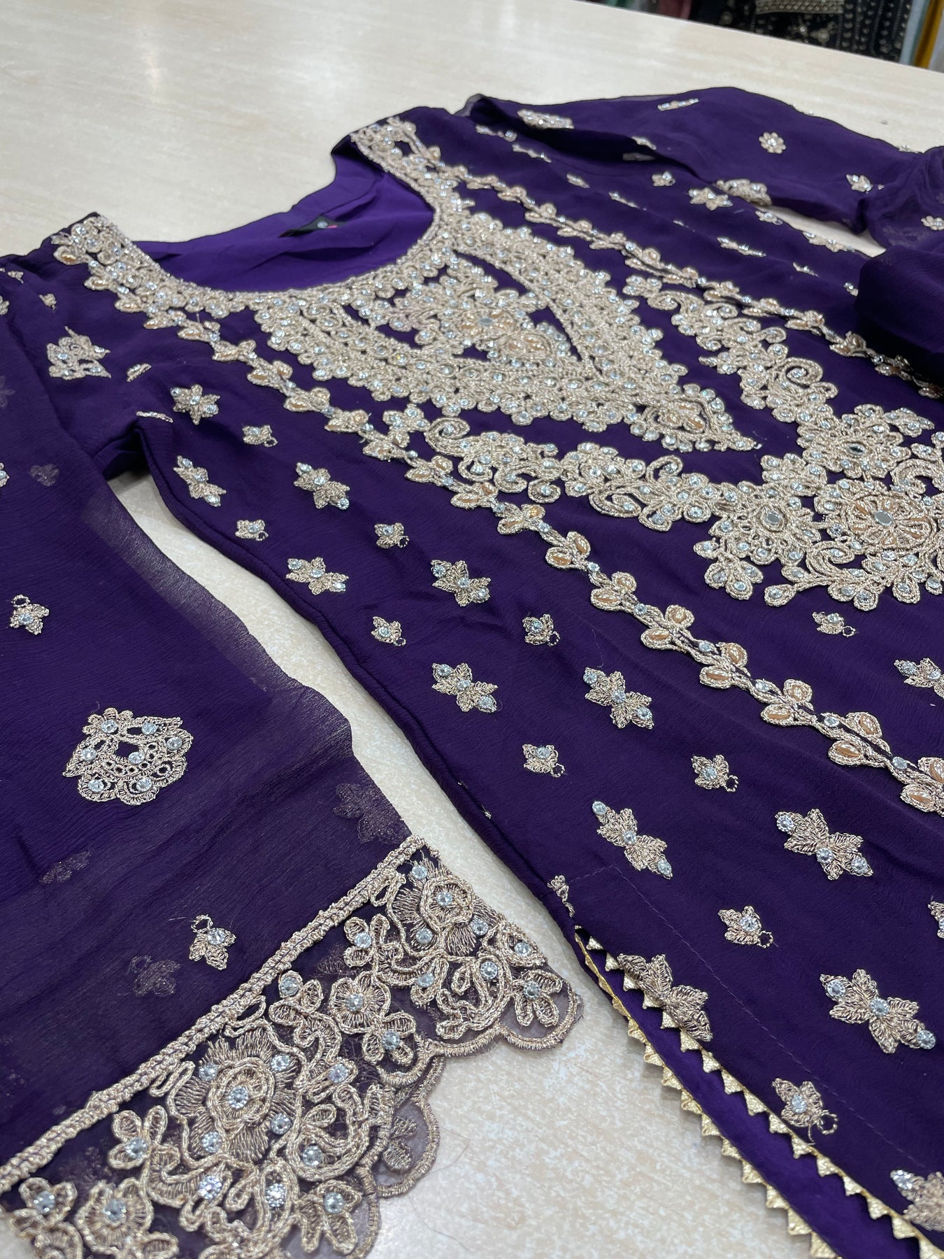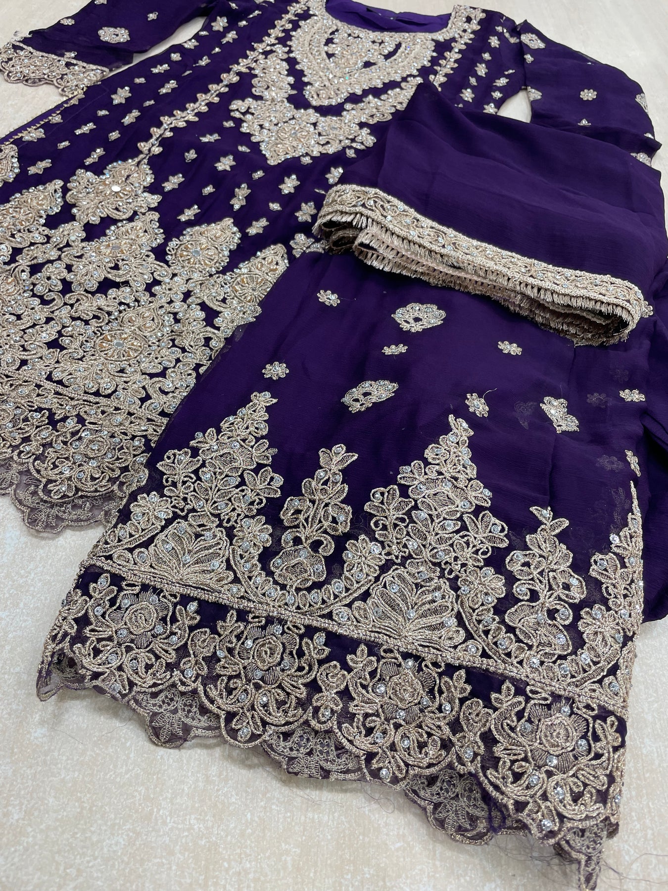 Aisha - Purple embroidered Plazo - Rose Gold Embroidered & Gem work - 3Pcs