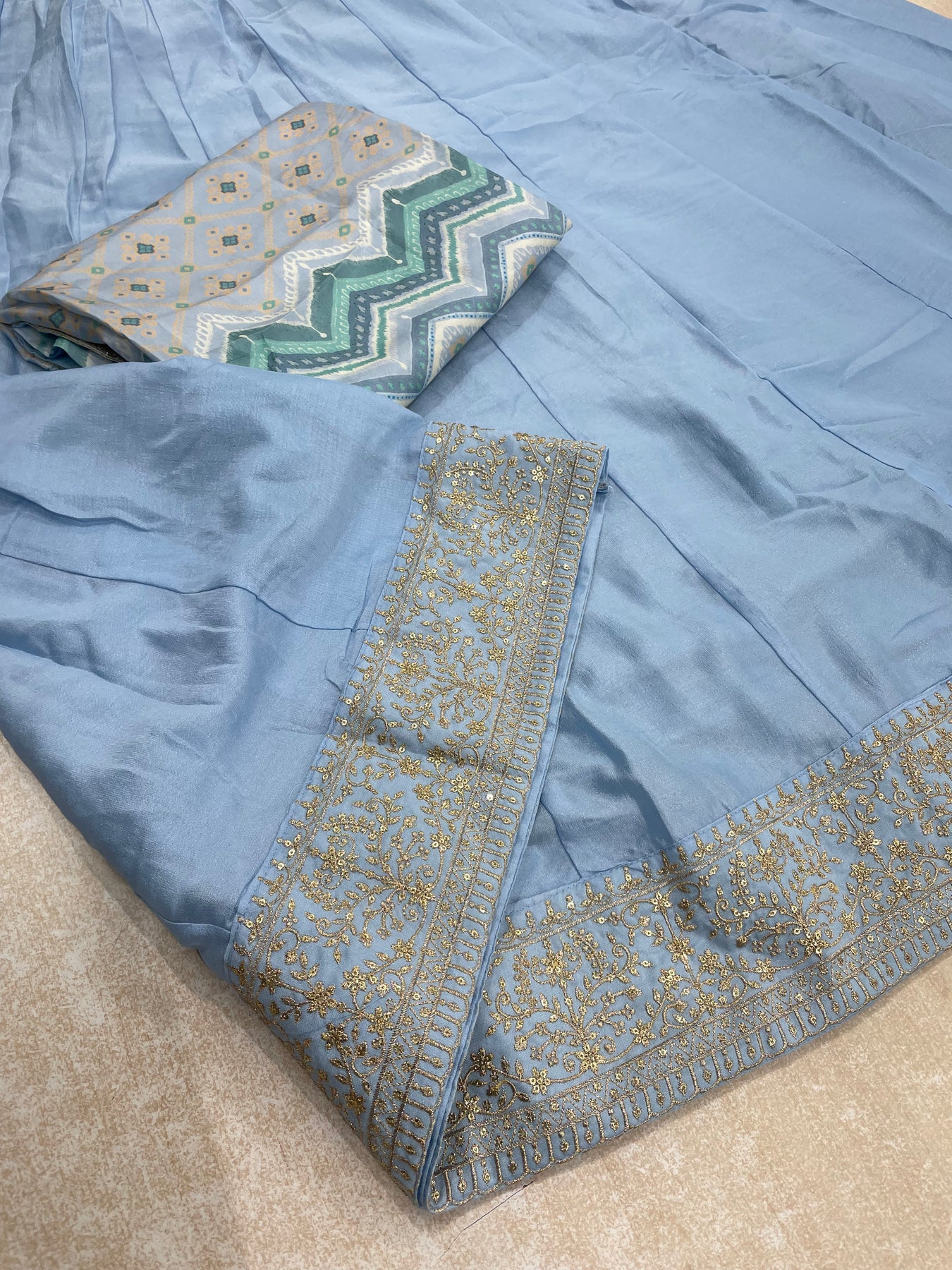 Yasmin -  Sky Blue Bhagalpuri Silk Frock with Digital Print Dupatta - 2pcs