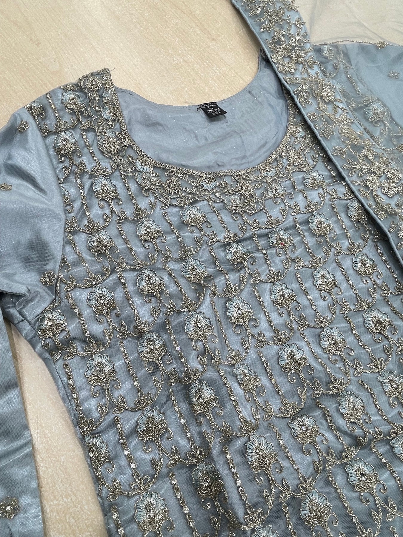 Refined, radiant, and ready for every celebration — Areesha is a beautifully crafted 3-piece Shalwar Kameez suit, made from delicate net fabric and adorned with shimmering white gold embroidery threadwork and gem detailing. With embellishments extending to the back of the kameez, this suit is designed to impress from every angle, offering just the right amount of sparkle for weddings, festive events, or elegant evenings.