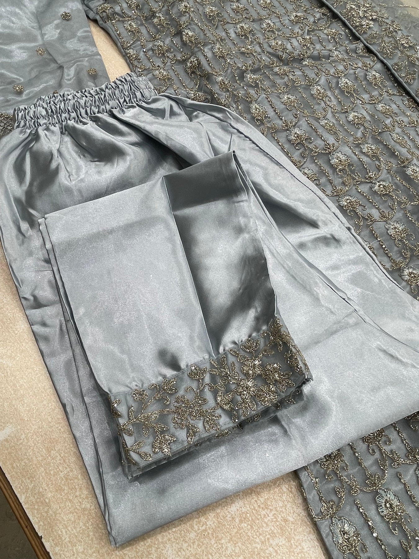 The kameez measures 45.5 inches in length across all sizes, striking the perfect balance between traditional charm and modern elegance. It’s paired with satin trousers that add a soft sheen to the overall look, featuring a matching embroidered border at the hem to tie the outfit together with subtle sophistication. The 40-inch trouser length gives a graceful drape that complements the flowing silhouette of the top.
