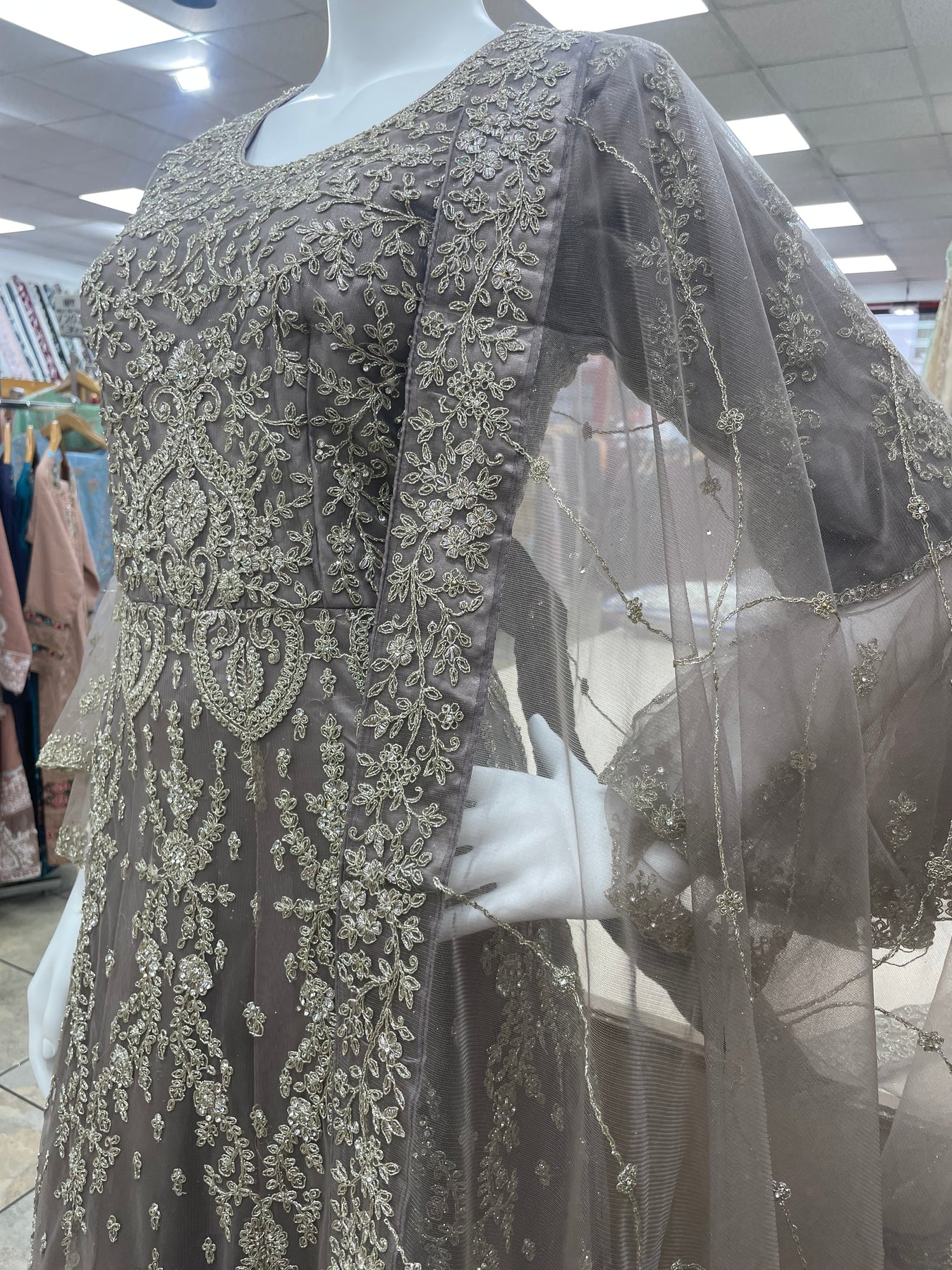 Jannah - Stone Grey Heavy Embroidered Net Party Gown with Bell Sleeves/White Gold Embroidered - 3pcs