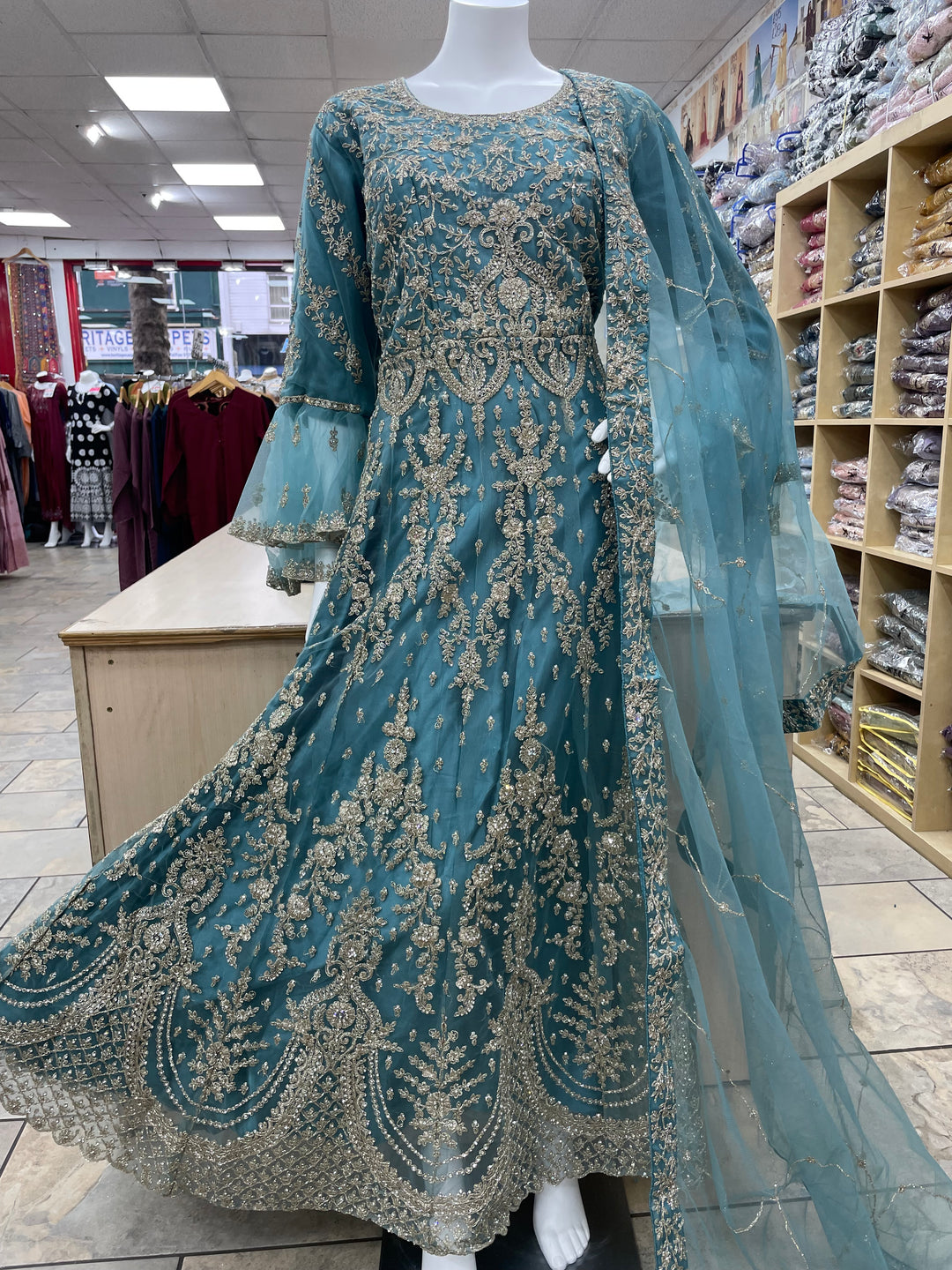 Jannah - Dark Teal Heavy Embroidered Net Party Gown with Bell Sleeves/White Gold Embroidered - 3pcs