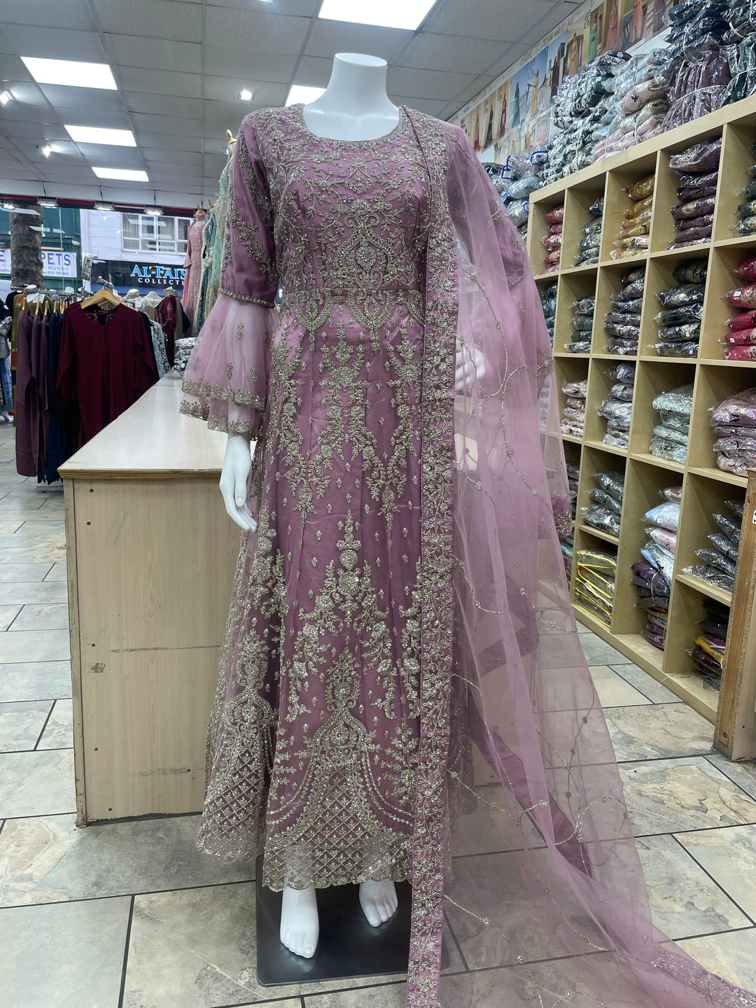 Jannah - Lavender Heavy Embroidered Net Party Gown with Bell Sleeves/Copper Gold Embroidered - 3pcs