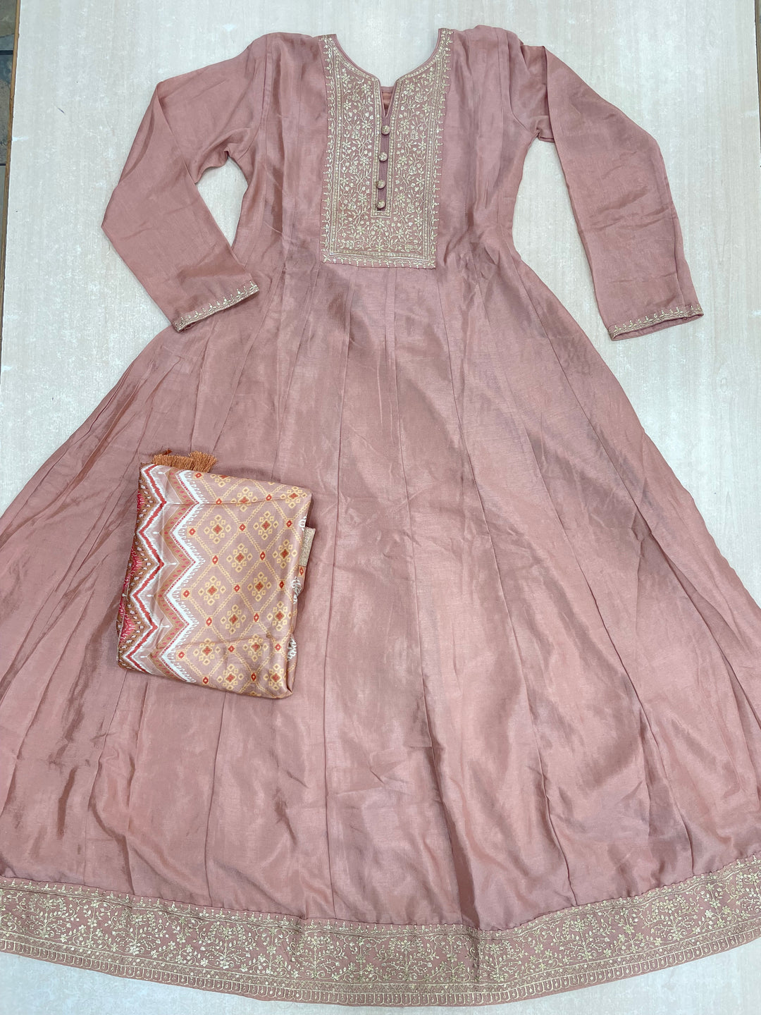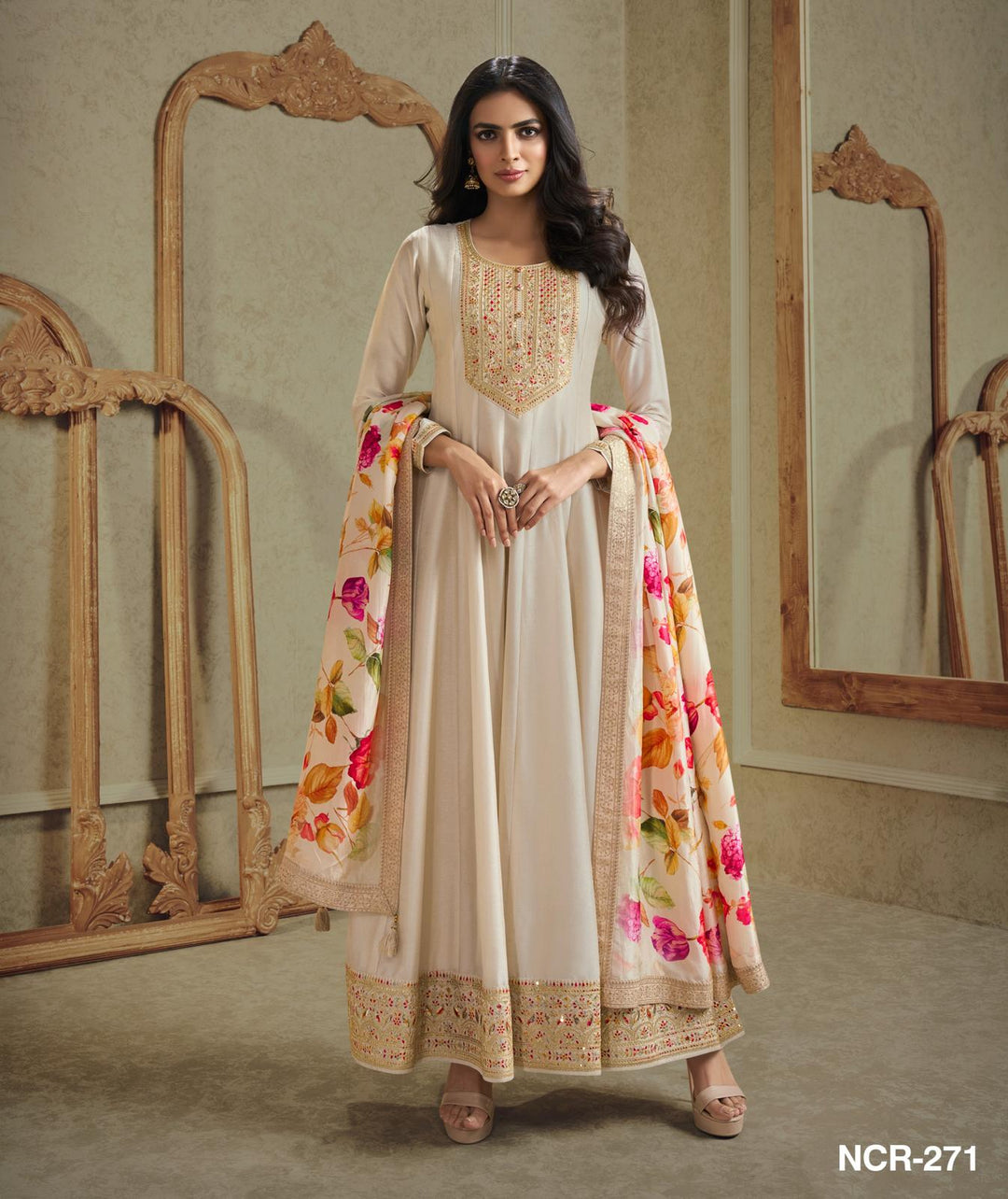 Nisa - Cream silk embroidered anarkali - 2 Pcs