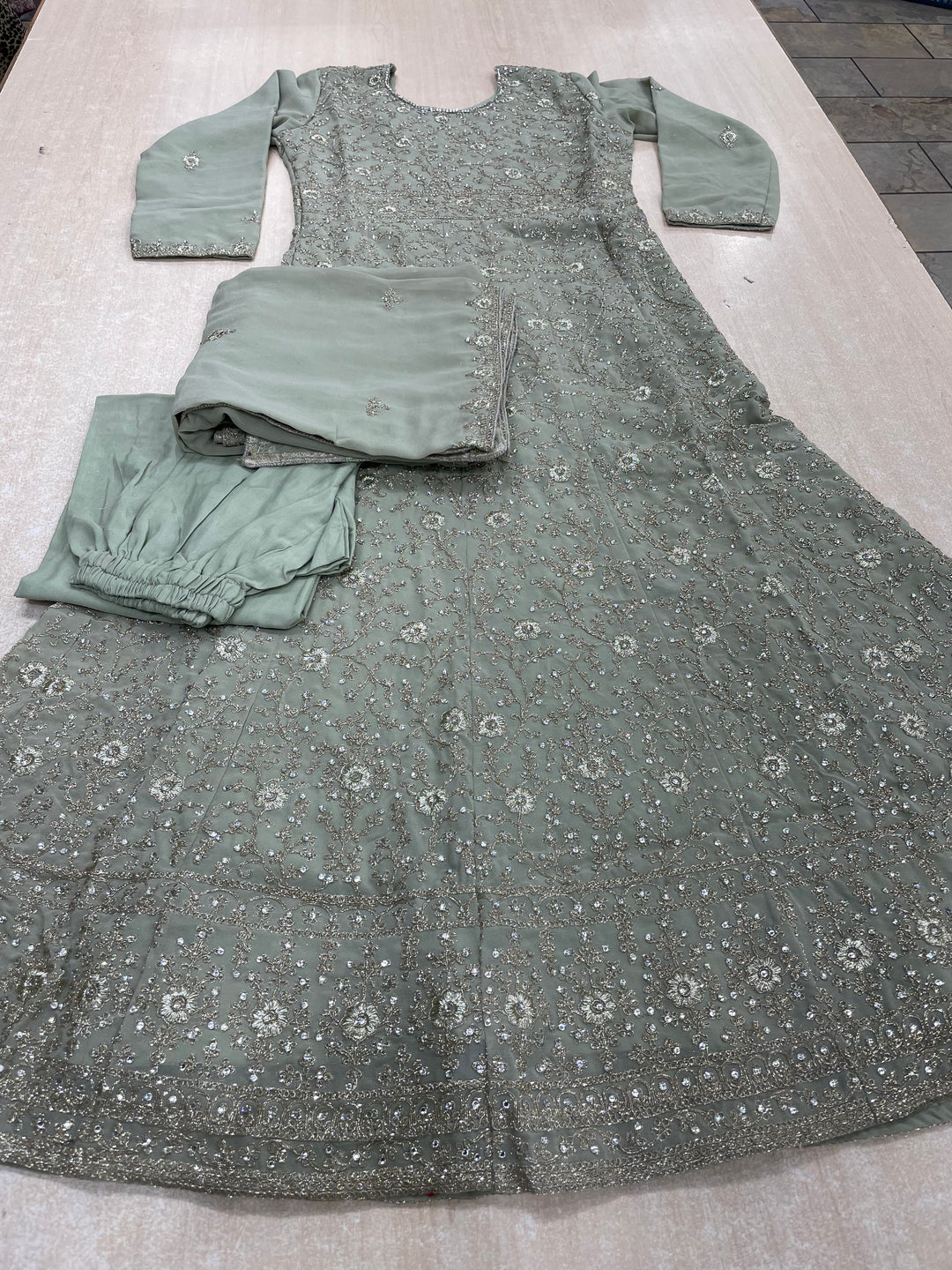 Amani - Sage Green Heavy Embroidered Chiffon Gown - White Gold Embroidery - 3pcs