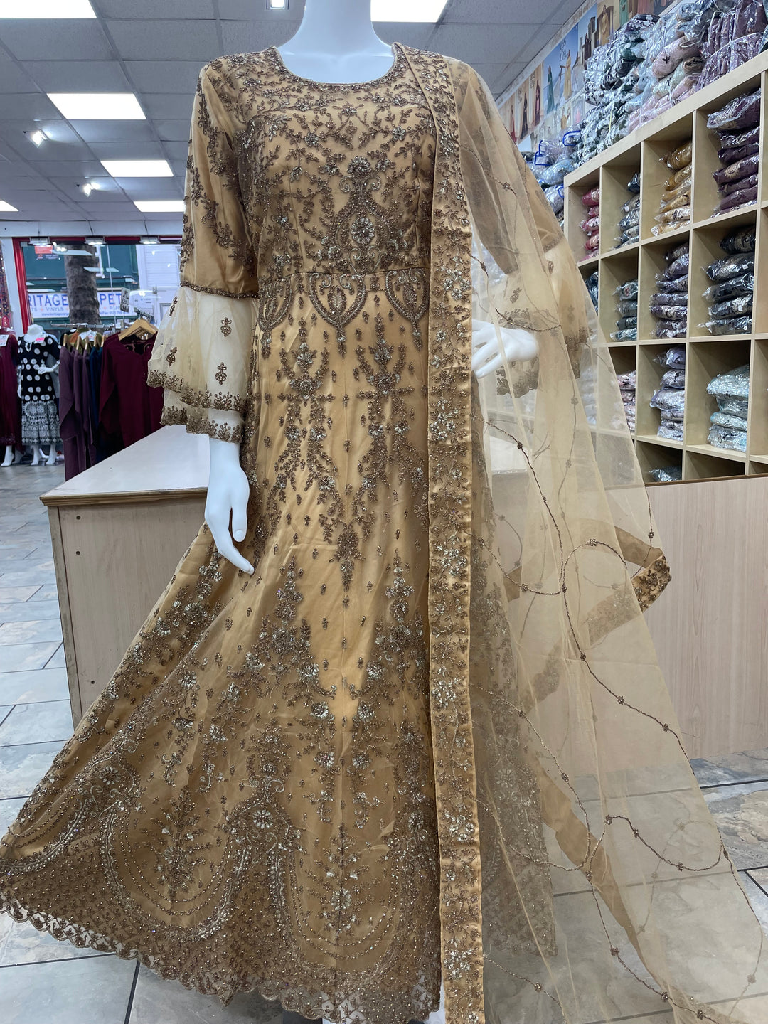 Safiya - Champagne Gold Heavy Embroidered Net Gown with Net Scarf - 3pcs