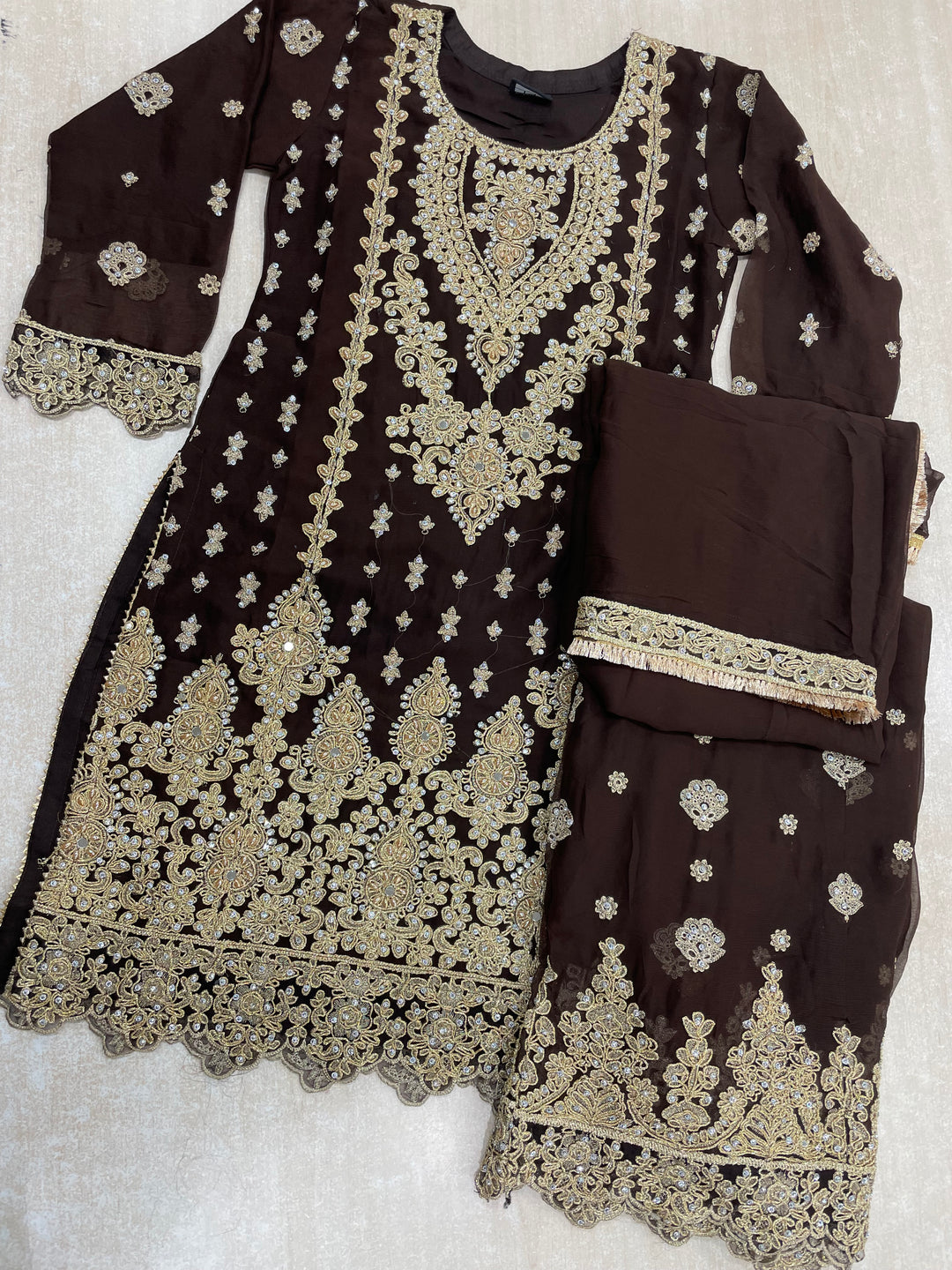 Aisha - Brown embroidered Plazo - Gold Embroidered & Gem work - 3Pcs