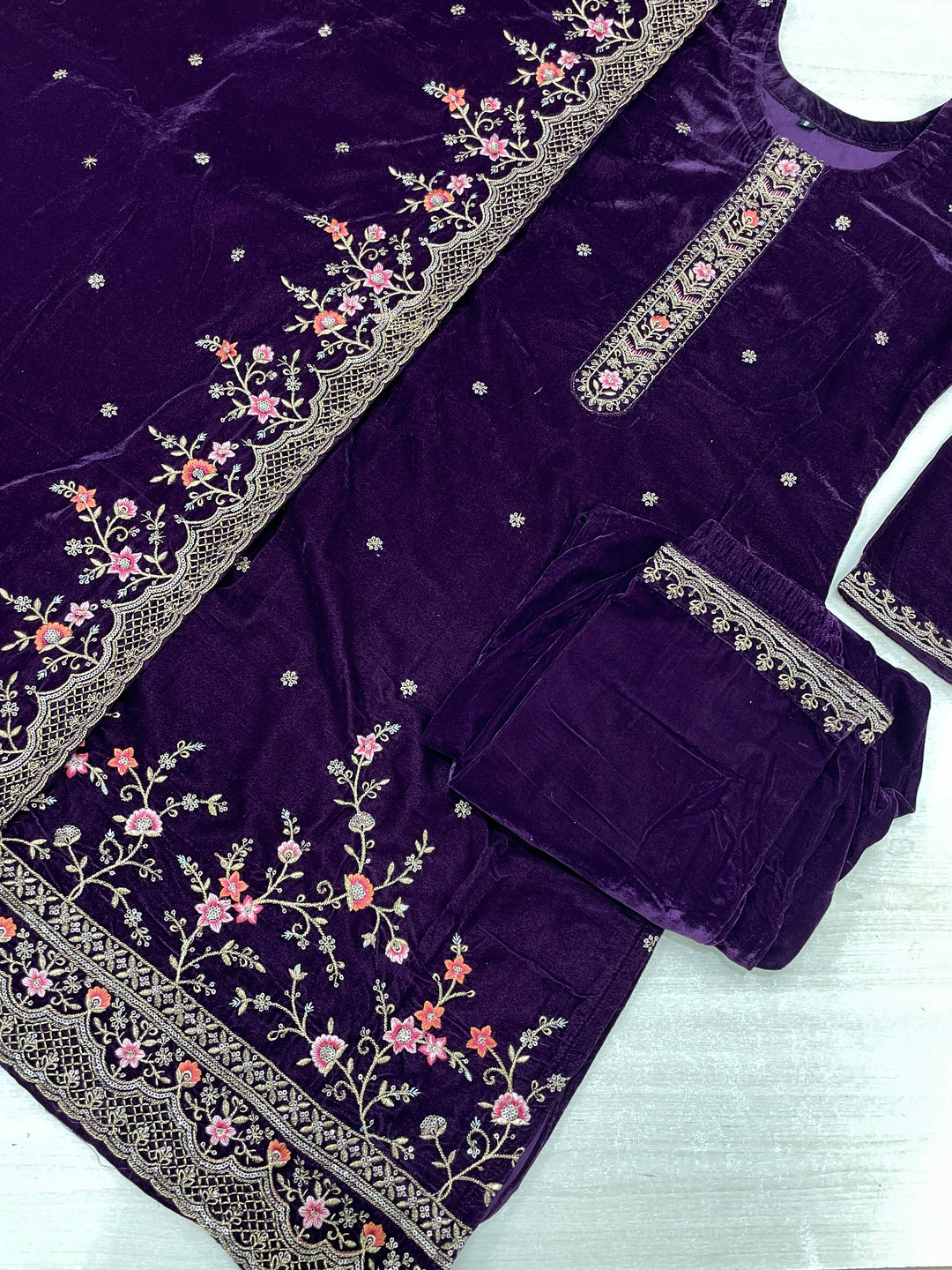 Purple Velvet Kameez - Embroidered & Gem work - 3Pcs
