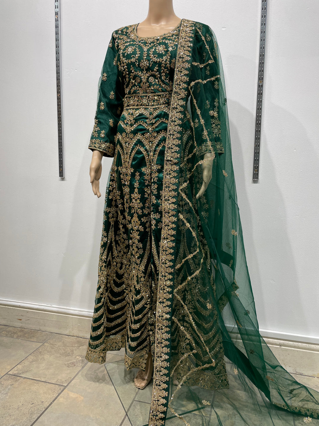 Meher - Dark Green Heavy Embroidered Gown with Front Split - 3pcs