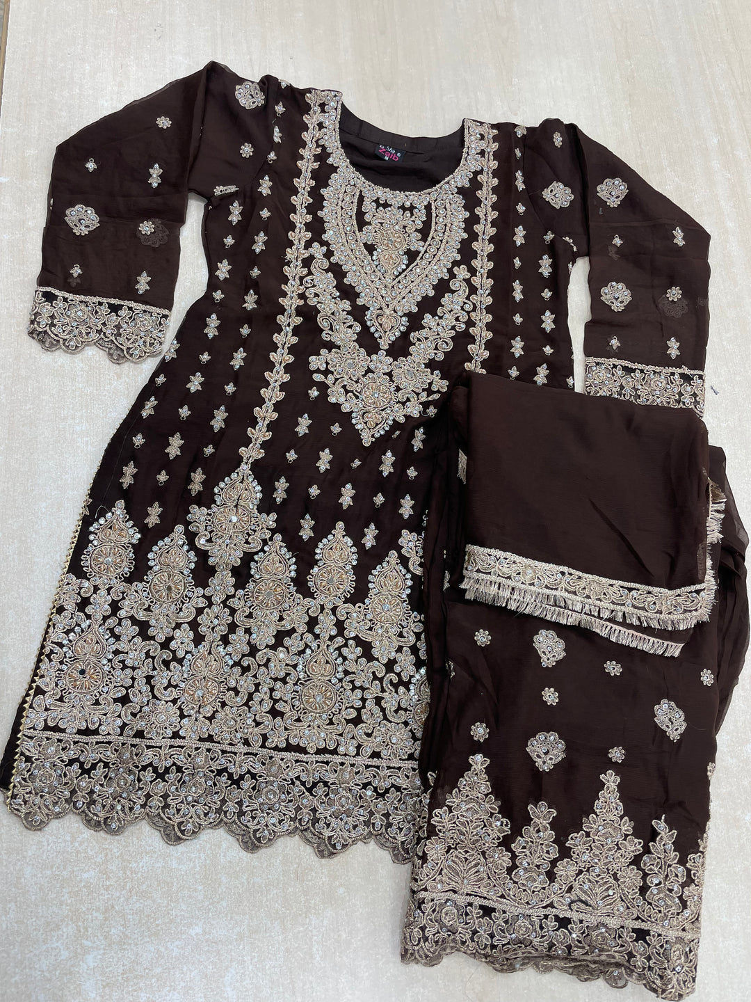 Aisha - Brown embroidered Plazo - Rose Gold Embroidered & Gem work - 3Pcs