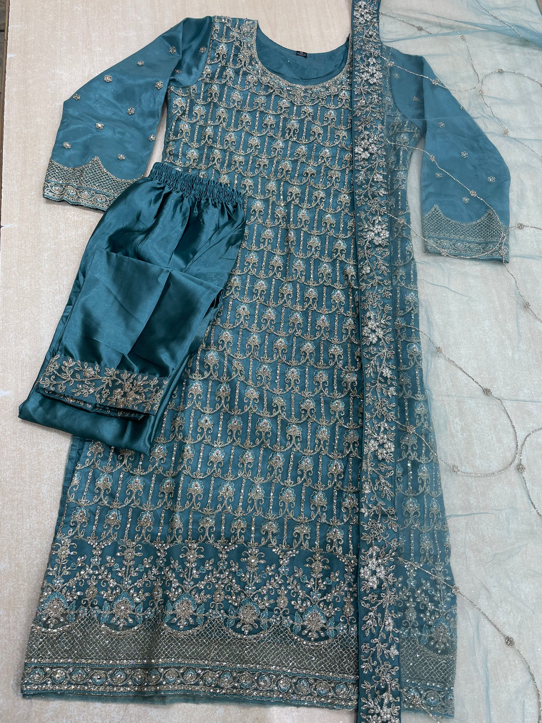 Areesh – Teal Net Embroidered Shalwar Kameez with Satin Trousers – 3 Pcs