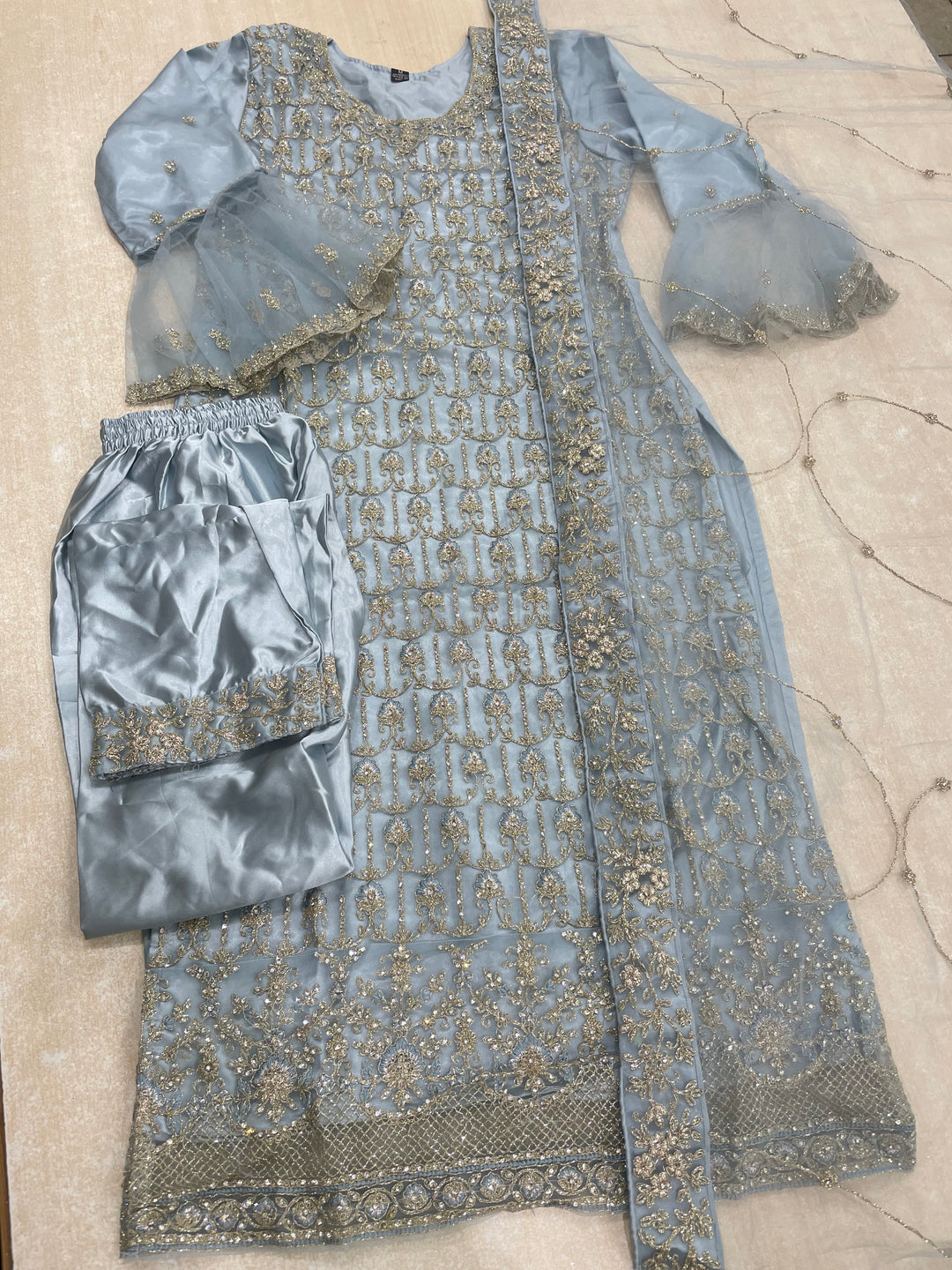 Areesha – Sky Net Embroidered Shalwar Kameez with bell sleeves - Satin Trousers – 3 Pcs
