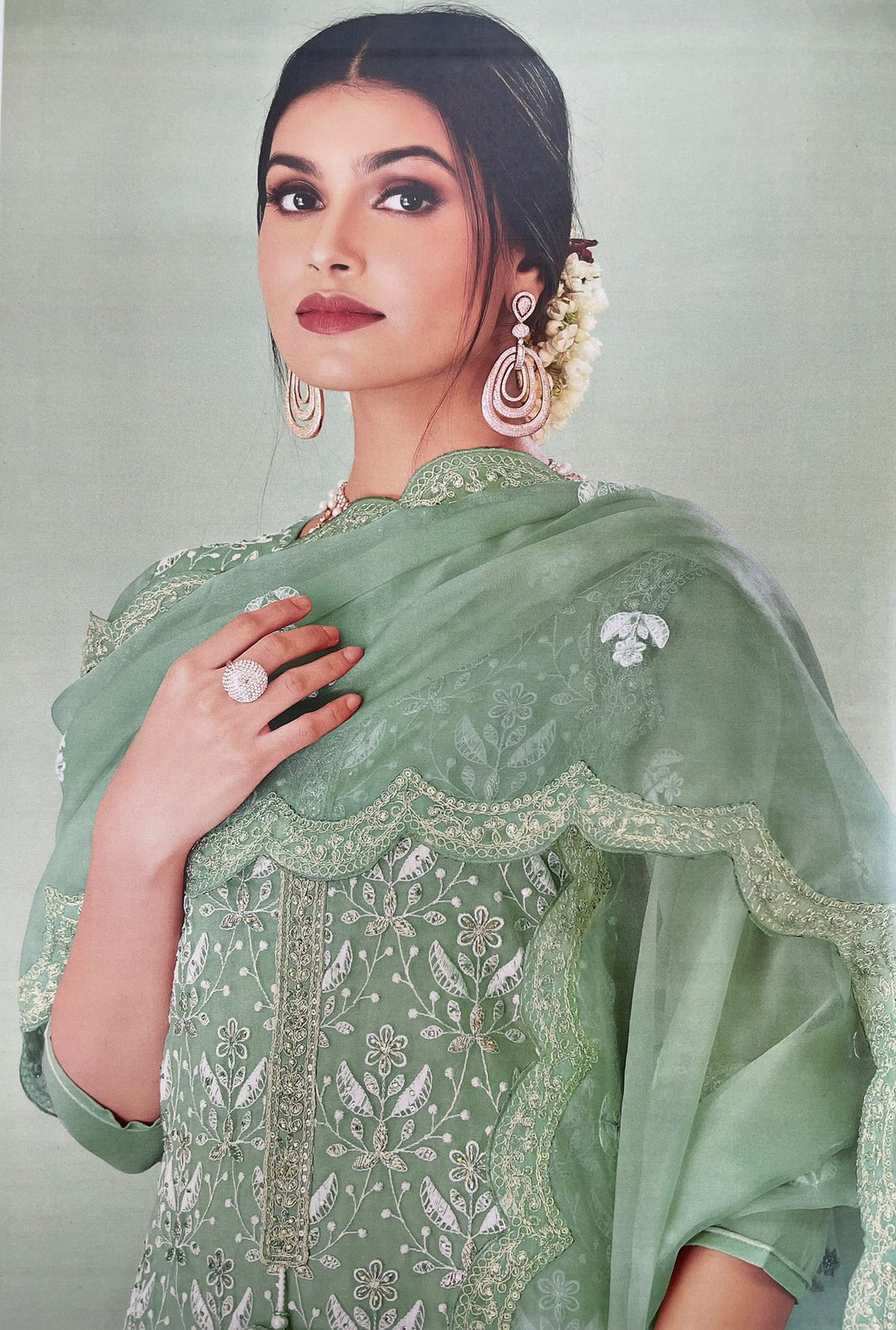 Areesha – Pistachio Green Net Embroidered Shalwar Kameez with Satin Trousers – 3 Pcs